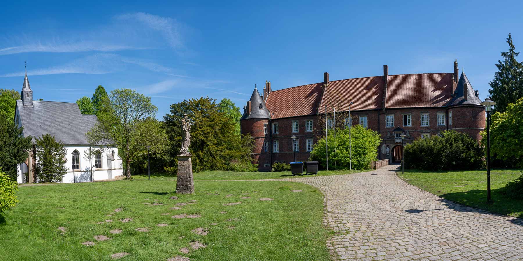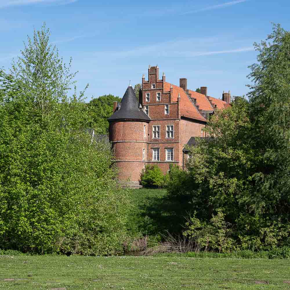 So bog ich am NSG Am Quellmühlenbach recht ab und erreichte an der Hertener Straße den Weg des Originaltracks. Nachdem ich das Klinik / Schlossgelände erreicht hatte drehte ich noch eine Extrarunde um die beiden schönen Schlossteiche und stattete auch dem Schloss einen kurzen Besuch ab. Die Schlossgebäude werden von der LWR Klinik für diverse Tagestherapien benutzt. Man kann zwar in den Innenhof rein, aber eine Besichtigung / Führung gibt es nicht.