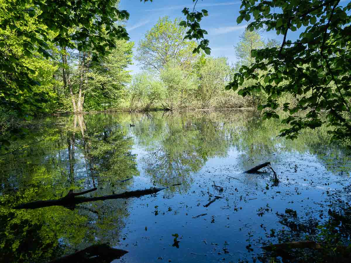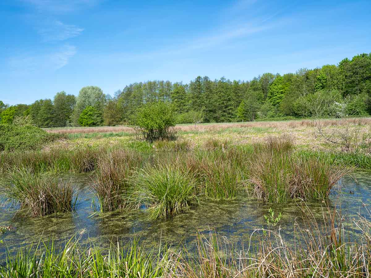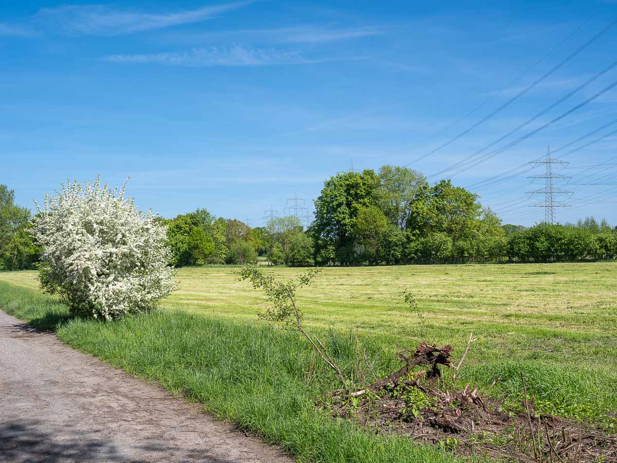 Ich wanderte vom Park in den Schlosswald und nahm dort eine kleine Abkürzung, die mich an einen mitten im Wald gelegenen Teich vorbei führte. Unterwegs waren einige Radfahrer und Gassi Geher. Der weitere Weg führte in nordöstliche Richtung nach Westerhold. Die Strecke verlief über offenes, flaches wiesenartiges Gelände mit schöner, aber wenig spektakulärer Aussicht.