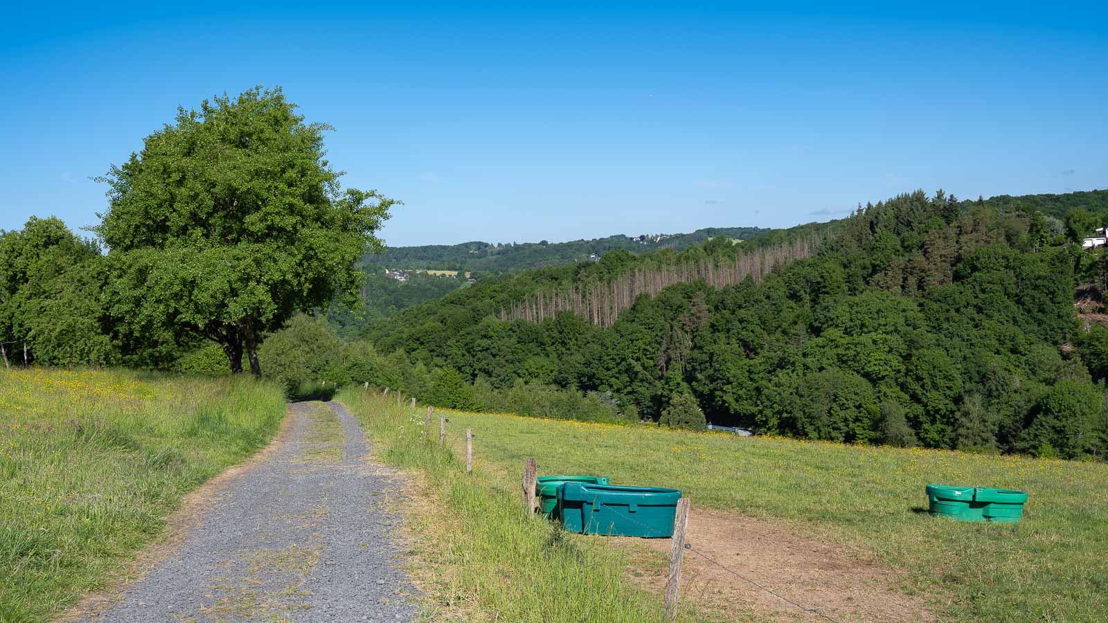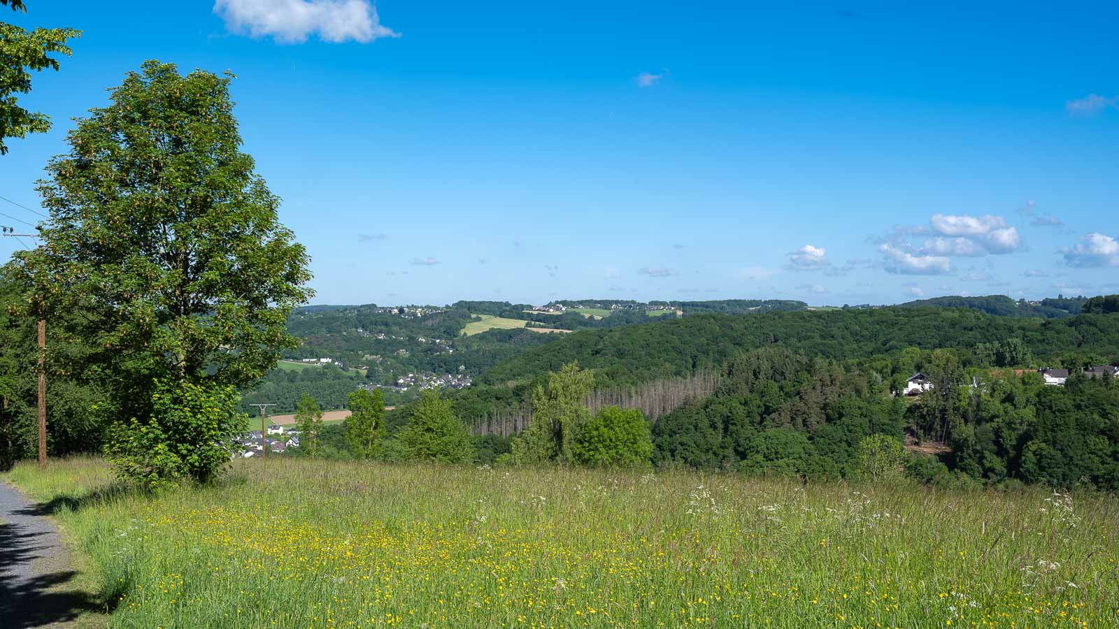 Nach etwa 8 km Wanderstrecke fand ich eine schöne Bank für meine Mittagspause und nach 10 km führte mich mein Wanderweg aus dem Naafbachtal hinaus, zurück in Richtung Wahlscheid. Die Talwanderung könnte jedoch noch ca. 3 km weiter bis nach Kreuznaaf an der B484 fortgesetzt werden. Für mich war das keine Option und so wanderte ich erst wieder mal etwas bergauf und wurde erneut durch Fernblicke belohnt.
