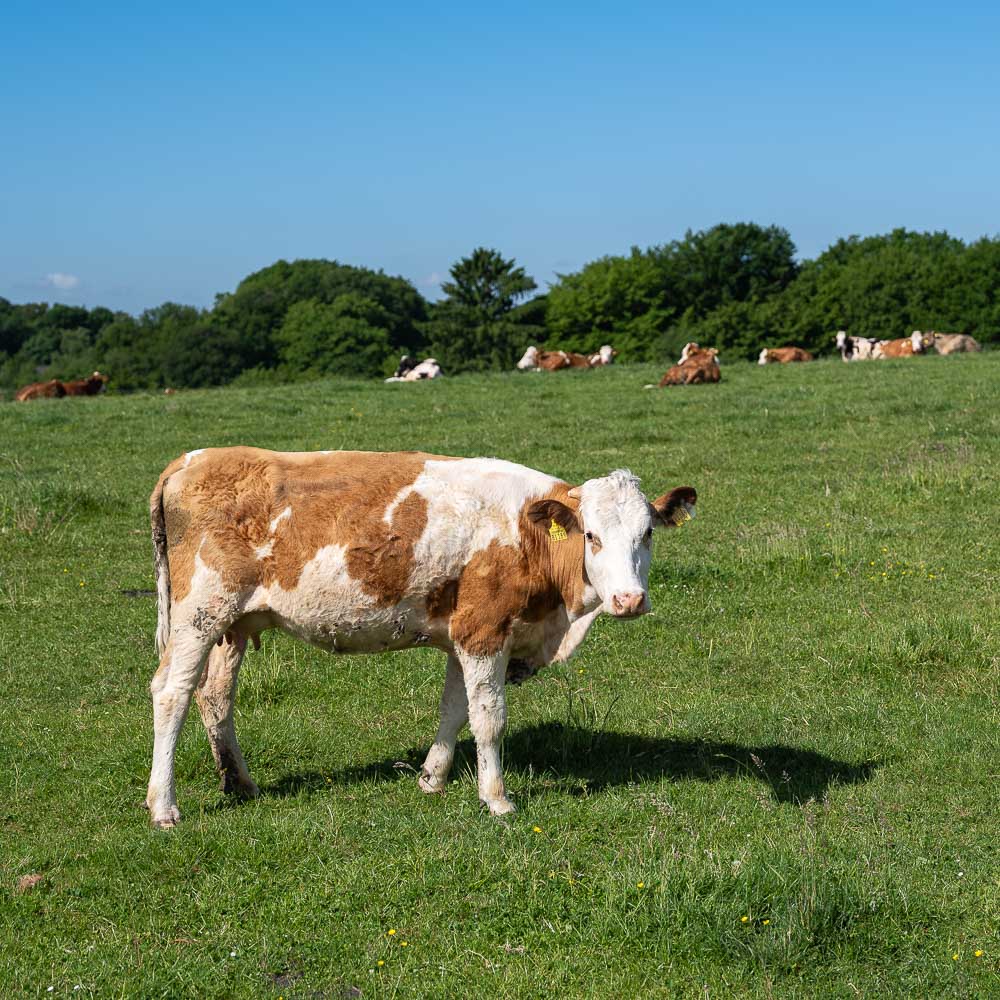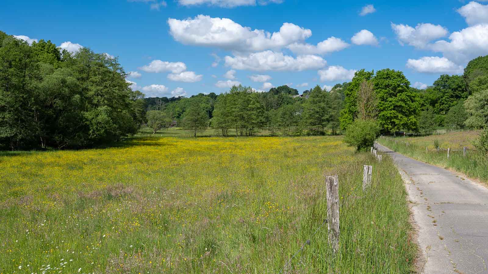 Am Ende der Bebauung ging es am Rande der Agger entlang, wobei ich von dem Flüsschen aber nicht sehr viel zu Gesicht hat bekam. Bald ging es leicht bergauf und weiter oben wurde die Aussicht besser. Das Gelände war weiter oben flach und ich hatte einen Fernblick bis in das Siebengebirge. Die Strecke unterwegs wechselte zwischen Wald und offenem Wiesengelände, am besten beschrieben mit den Worten : lieblich.