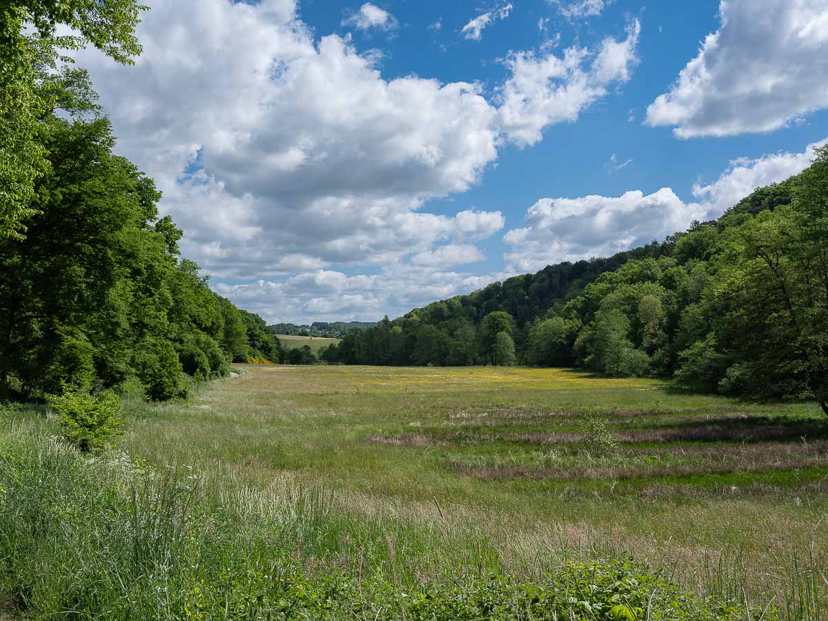 Die Strecke durch das Naafbachtal verlief dann über einen breiten, zum Glück nicht asphaltierten Weg der von deutlich mehr Radfahrern als Wanderleuten frequentiert wurde. Es handelte sich um ein sehr weites Tal mit vielen gelben Wiesen, alles Butterblumen. Der Löwenzahn hatte sich schon in Pusteblumen verwandelt.