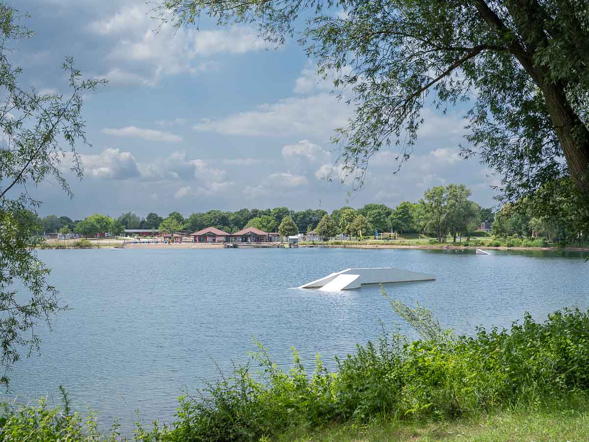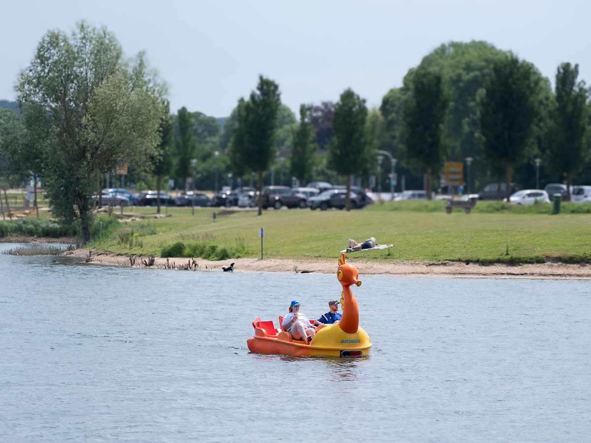 Rund um den See verläuft ein breiter, kinderwagentauglicher Weg der auch von Radfahrern genutzt wird. Wir wanderten hier im Uhrzeigersinn. Erwähnenswert sind die zahlreichen Pausenbänke und auch an vorbildlichen Toilettenanlagen mangelt es nicht. Kurz hinter einer Jugendherberge gelangte wir an ein großes Freibad, das zwar geöffnet hatte, aber wenig bis gar nicht besucht war. Den Plakaten nach werden hier am Wochenende öfters Events wie Beach Partys etc. veranstaltet.