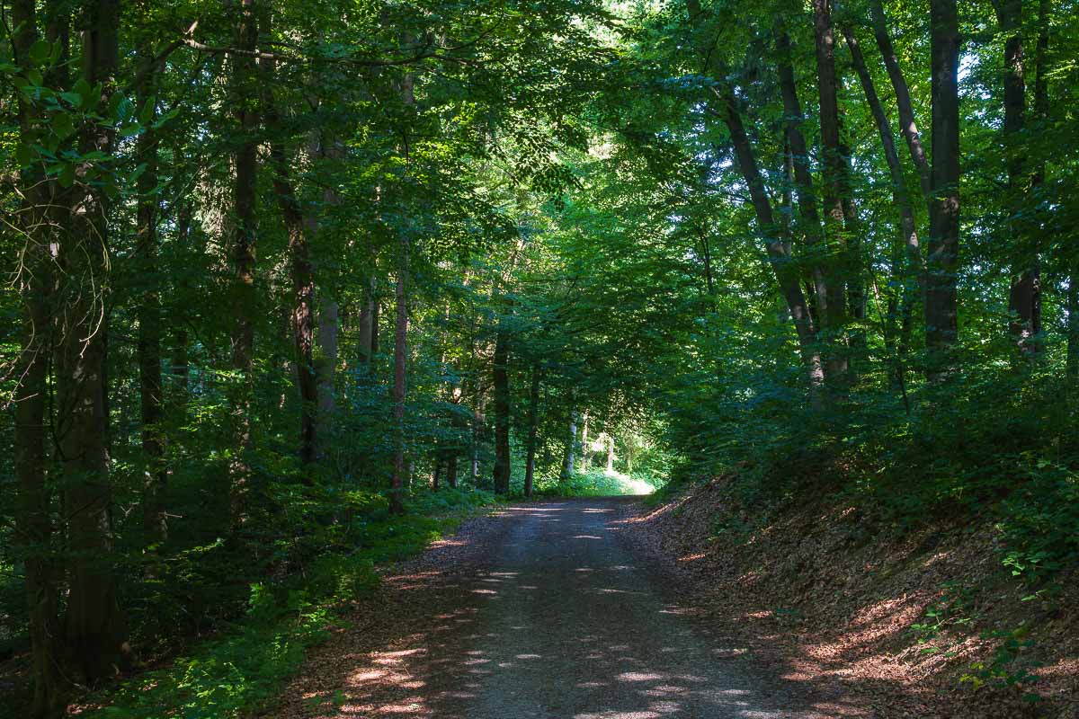 Also machte ich mich leichtfüßig los auf den Rundweg, den ich wie vorgesehen entgegengesetzt zum Uhrzeigersinn startete. Innerorts kam ich sowohl an der katholischen, als auch an der protestantischen Kirche vorbei. Bei den Katholiken war alles geschmückt für die anstehende Prozession, von der ich aber nichts mit bekam, da ich schon recht früh unterwegs war.