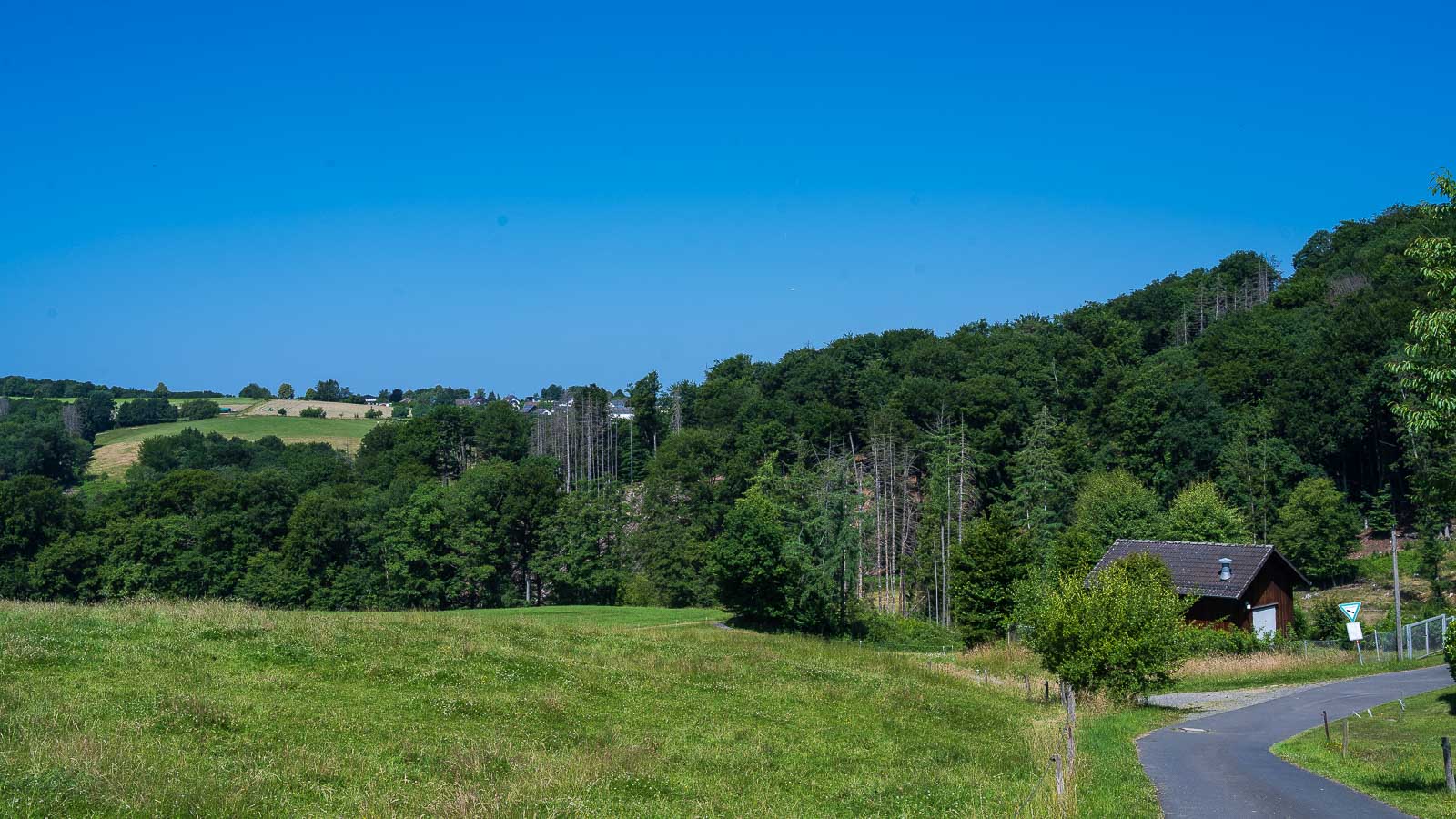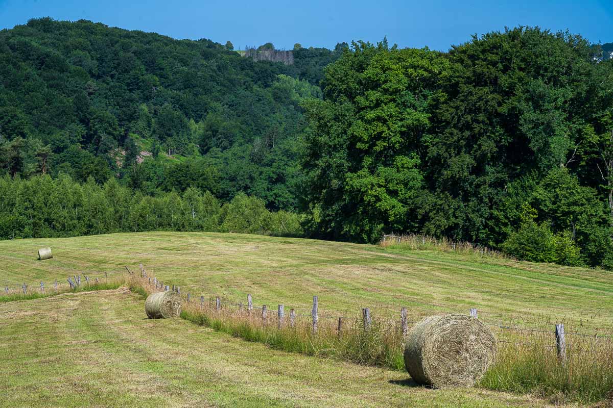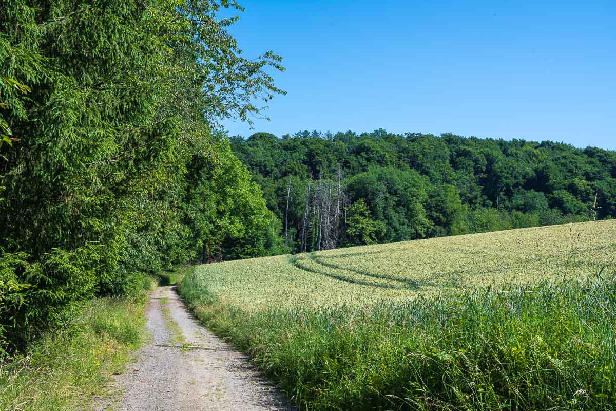 Die Wegführung ist abwechslungsreich : es ging über offenes Gelände, ein gewisser Waldanteil war auch dabei. Vorzugsweise wanderte ich am schattigen Waldrand entlang mit schöner Aussicht über das Bergische Buckelland. Klasse fand ich, daß die wenigen Anstiege ausschließlich im Wald stattfanden und somit weniger schweißtreibend ausfielen.