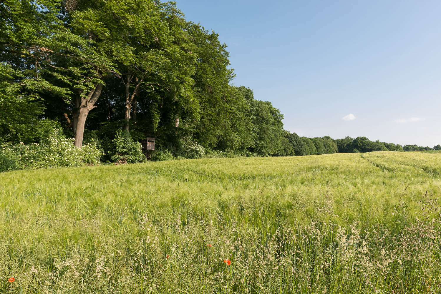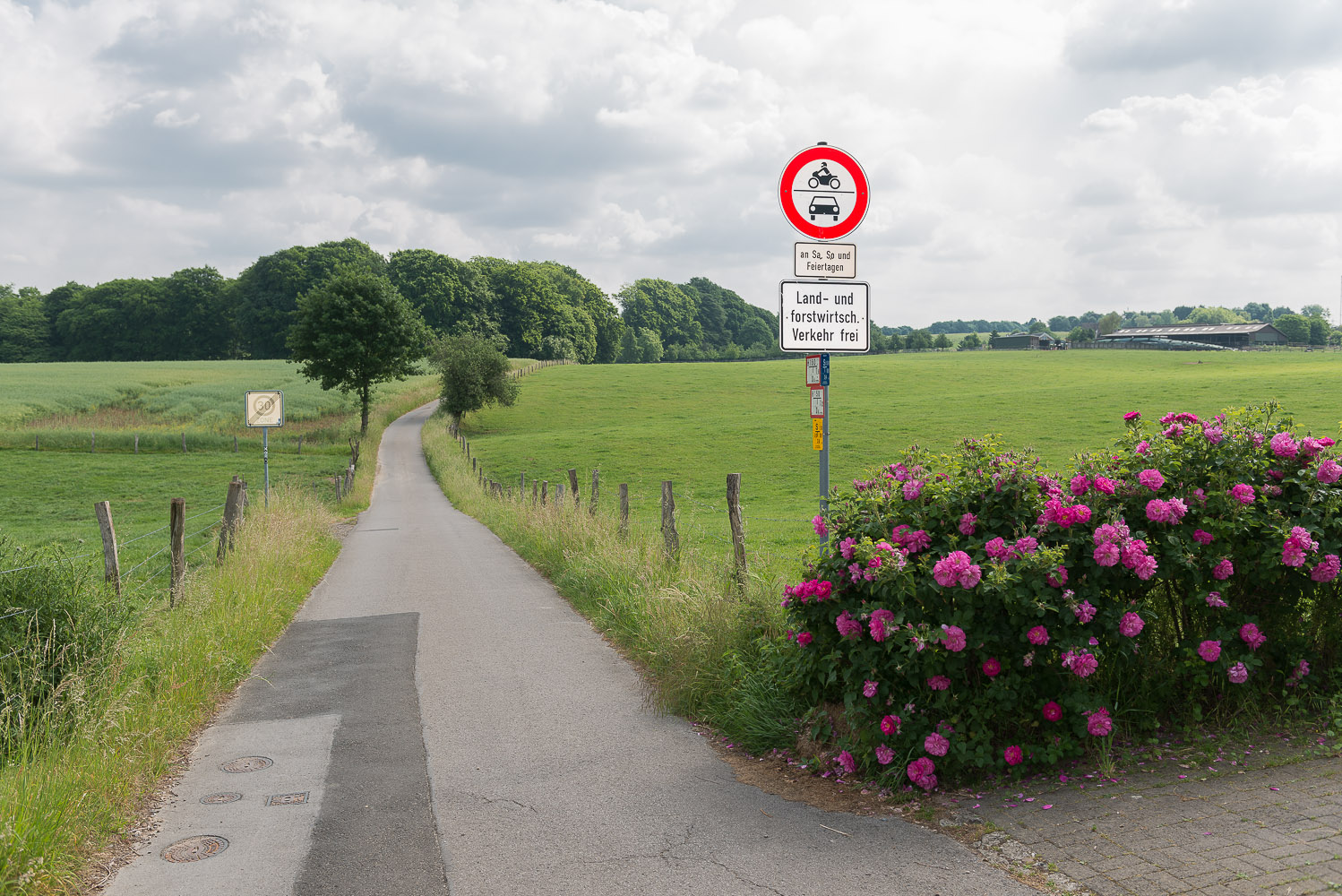 Kurz vor Hülstrunk stehen einige Kühe auf der Weide die natürlich „auf die Platte gebannt“ werden. Am Ortsausgang muss ich mein mitgenommenes Makro-Obketiv auspacken um einige schöne Rosen zu fotografieren. Kurz danach kommt mir die erste Spaziergängerin mit Hund entgegen. Der hat Angst vor meiner Kamera und ist nur mit Mühe dazu zu bewegen an mir vorbei zu gehen.