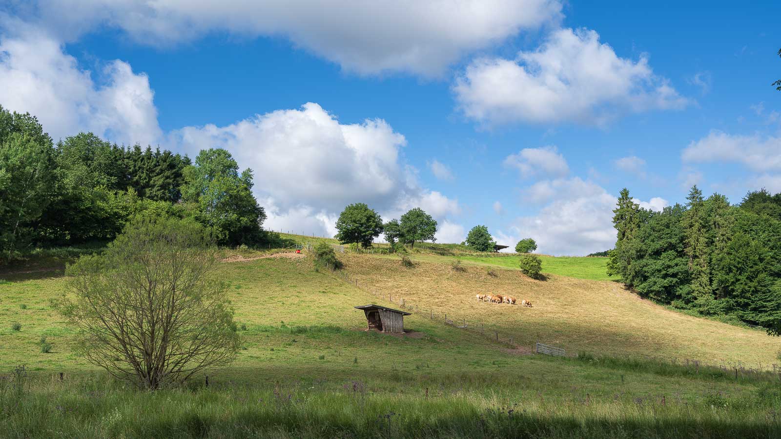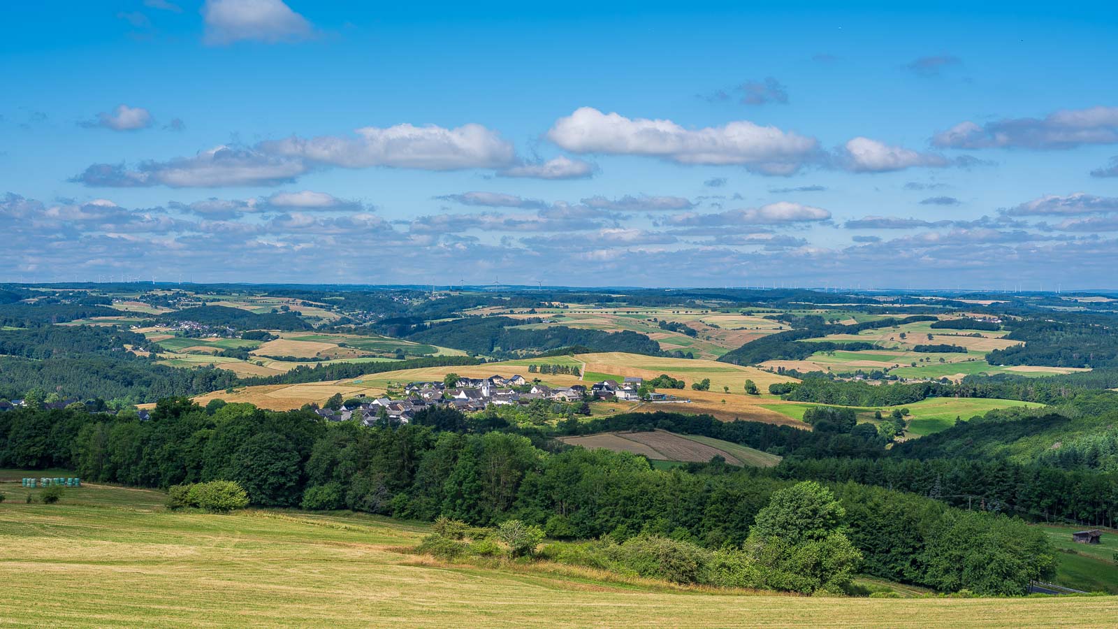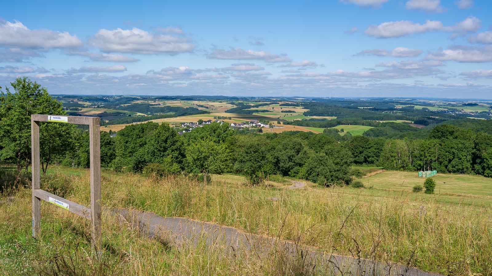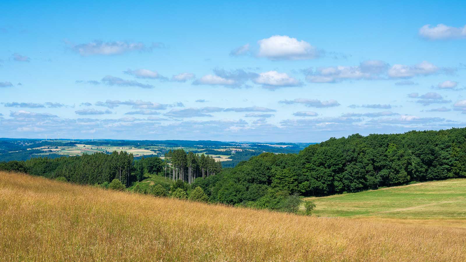 Der Abstieg vom Gipfel führt nach einem kurzen Waldteil noch etwa 1.5 km über das offene Gelände einer Hochebene. Von hier hat man eine tolle Aussicht über die Eifel. Wegen der Höhenlage dürfte sich die Gegend im Winter gut für Langlauf eignen.
