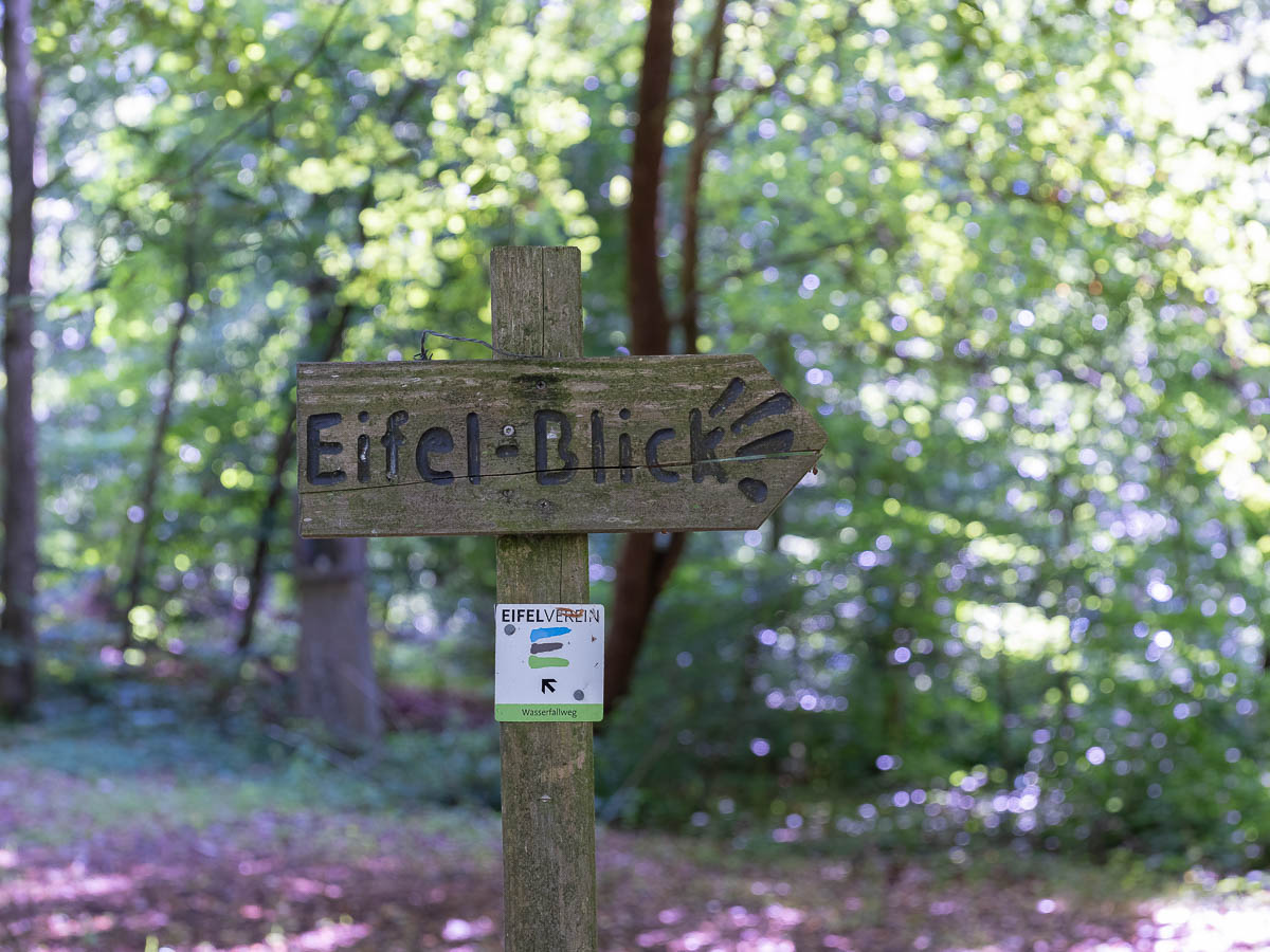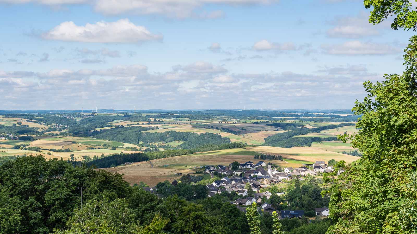 Der Weg dorthin war schön, aber unspektakulär und ging langsam aber stetig bergauf. Auch über das kleine Örtchen Mahlberg läßt sich nicht viel berichten. Es liegt immerhin ca. 460 m hoch. Hinter Mahlberg geht es dann auf den Michelsberg. Zu meinem Entsetzten kann man da auch fast mit dem Wagen rauf fahren. Der Gipfel ist mit Bäumen bewachsen die einen Blick über die Eifel verhindern. Zu diesem Zweck wurde vor dem eigentlichen Gipfel ein Aussichtspunkt „Eifelblick“ errichtet, der über einen kleinen, ausgeschilderten „Side-Step“ erreicht wird. Von hier aus hat man einen tollen Fernblick über das Örtchen Mahlberg hinweg. Ein Zuwachsen der Aussicht wurde durch entsprechende Baumschnittmaßnahmen verhindert.