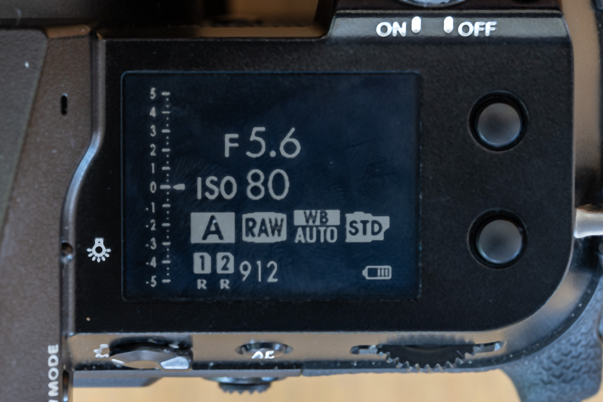 Das Schulterdisplay auf der Kamera sollte nun F 5.6, ISO 80, A und RAW anzeigen. Der Weißabgleich steht auf Automatik, ist aber wurscht da in RAW fotografiert wird.