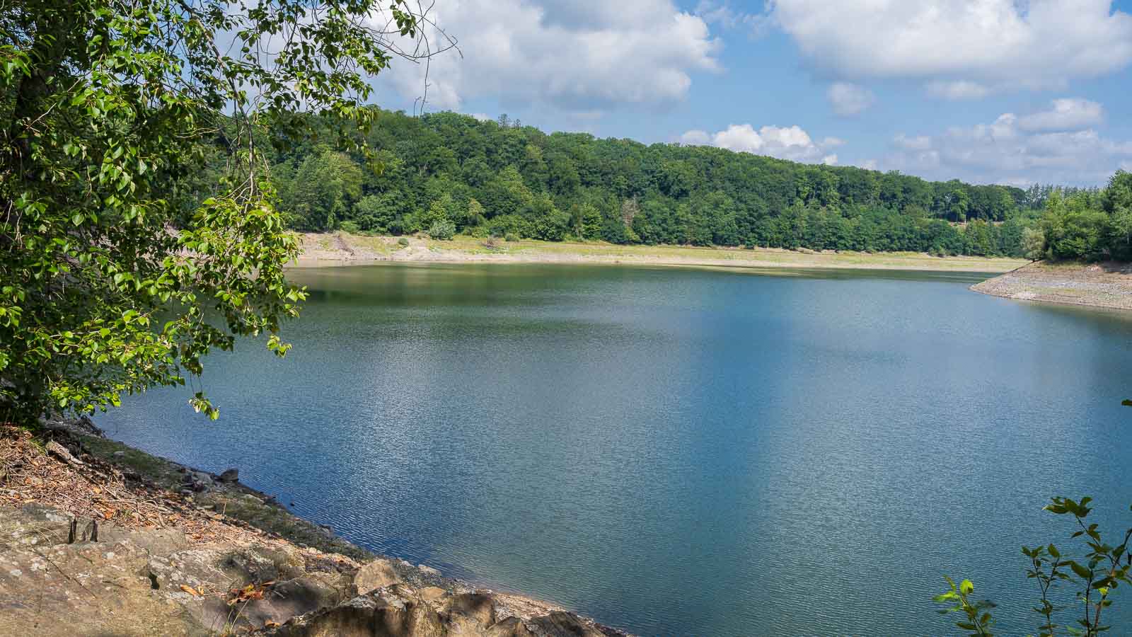 Hinter der kleinen Talsperre ging es bergauf in den Wald hinein. Danach gelangten wir in das Naturschutzgebiet Feldbachtal. Dieses schöne Tal durchwanderten wir bis zur Wuppertalsperre. Diese war wegen der bisherigen Trockenheit nur sehr schlecht befüllt. Zur Aufrechterhaltung eines ausreichenden Wasserpegels in der Wupper mußte viel Wasser aus der Talsperre abgelassen werden. Wir wanderten ca. 2 km oberhalb des Ufers mit einer etwas trostlosen Aussicht auf viele nackte Felsen.