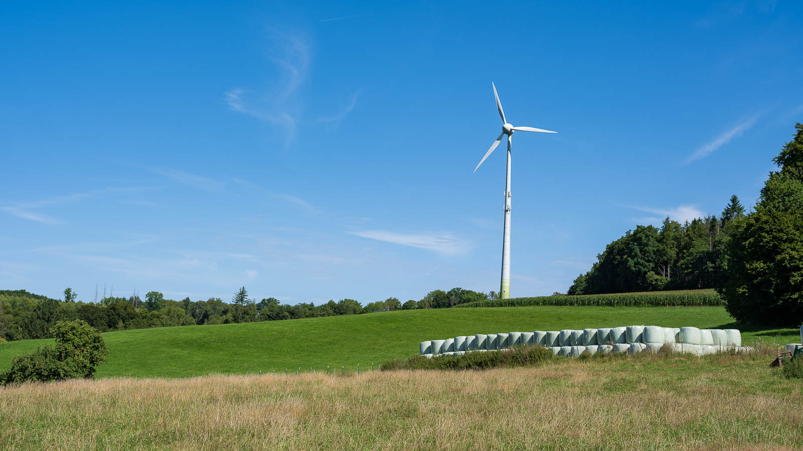 Auf dem ersten Drittel der Strecke war ein markantes Windrad von überall zu sehen. Natürlich mußte es abgelichtet werden. Der Streckenverlauf war abwechslungsreich. Da es mit fortschreitender Uhrzeit immer wärmer wurde, waren wir froh das einige schattige Waldabschnitte dabei waren.