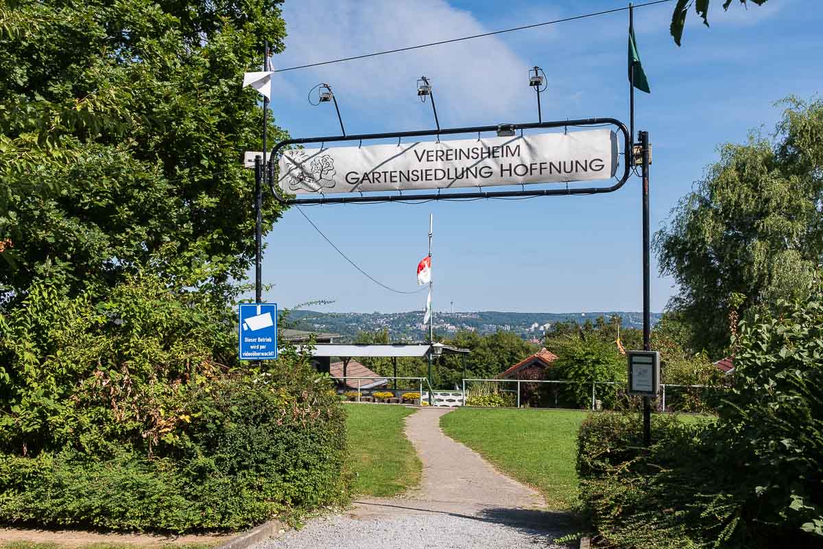 Ab und an mußten wir eine Straße queren, aber ansonsten bekamen wir vom Autoverkehr nichts mit. Auf den Höhen südlich von Wuppertal liegen einige Kleingartenkolonien, von denen wir einige durchquerten. Die machten alle einen liebevoll gepflegten Eindruck.