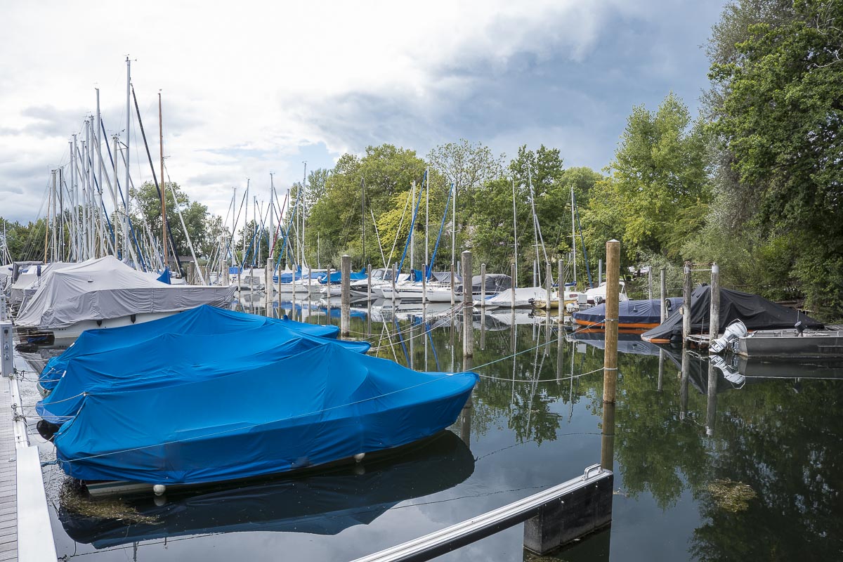 Weiter geht es am Ufer entlang, das hinter dem Hafen als Badestrand genutzt wird. Es gab nur wenig Badende, meist kleine Kinder die im Wasser planschten. Für mich als bekennenden Warmduscher (26°C ist das mindeste !) wäre das auch nichts. Am Ende des Strandes geht der Weg kurz ins „Landesinnere“ und verläuft danach weiter am Ufer entlang in Richtung Malerecke. Hier mündet die Arge in den Bodensee. Linkerhand davon gibt es einen größeren Yachthafen. In dem Yacht-Gelände ist die Fischereiforschungsstelle des Landes Baden-Württenberg untergebracht. Wir durchquerten dieses Gelände und gelangten zum Argensteig, einer Fußgängerbrücke über die Arge.