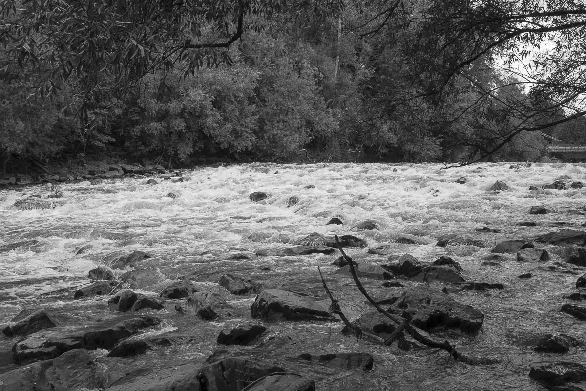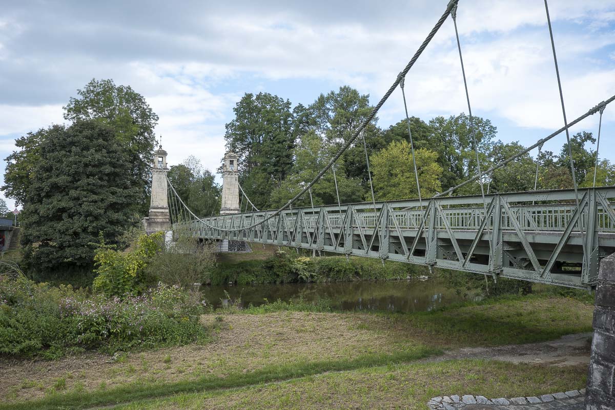 Auf der anderen Seite des Flusses wanderten wir ein Stück der Arge entlang bis zur nächsten Fußgängerbrücke. Hierbei handelte es sich um eine historische Hängebrücke. Vorbei an einigen Stromschnellen, in der Nacht hatte es kräftig geregnet und so rauschte die Arge recht kräftig, wanderten wir wieder zurück zum Argensteig.