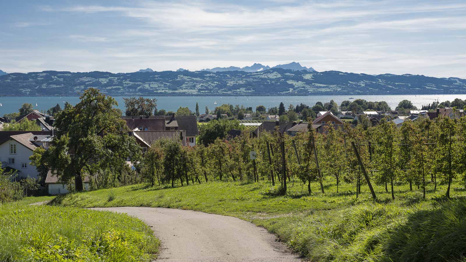 Anschließend wanderten wir bis zur Mündung des Eschbachs in den Bodensee, um diesen dann für heute endgültig zu verlassen. Es ging noch 1.5 km durch den Ort Wasserburg und dann durch Obstanbaugebiete und Weinberge langsam bergauf. Unterwegs fanden wir eine schöne Pausenbank auf der wir unsere mitgenommene Marscherpflegung verzehrten. Wir hatten nach einer Gelegenheit für einen Einkehrschwung gesucht, aber nichts gefunden. In den äußeren Ortsteilen von Wasserburg gab es keine Restaurants oder Gaststätten, da waren nur Ferienwohnungen.