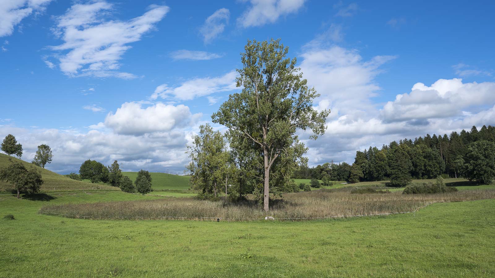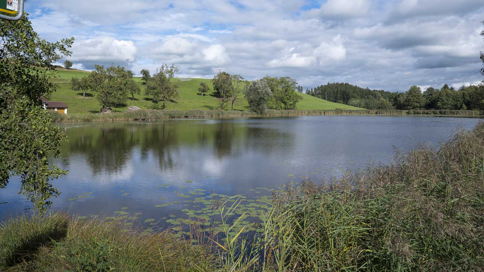 So starten wir die Wanderung erst um halb drei. Da es am Vormittag geregnet hatte und nun immer mehr die Sonne raus kam, wirkte die ganze Landschaft stellenweise wie blank geputzt. Gut daß ich dieses Mal meine dicke Berta (Fuji GFX100SII) dabei hatte. Marschverpflegung brauchten wir keine, schließlich hatten wir ja kurz zuvor zu Mittag gegessen. Nach einem 1.6 km langem Zuweg zur eigentlichen Runde, der uns am schönen Holzweiher vorbei führte, entschieden wir uns an der Abzweigung für links herum. D.h. wir liefen die Runde im Uhrzeigersinn.