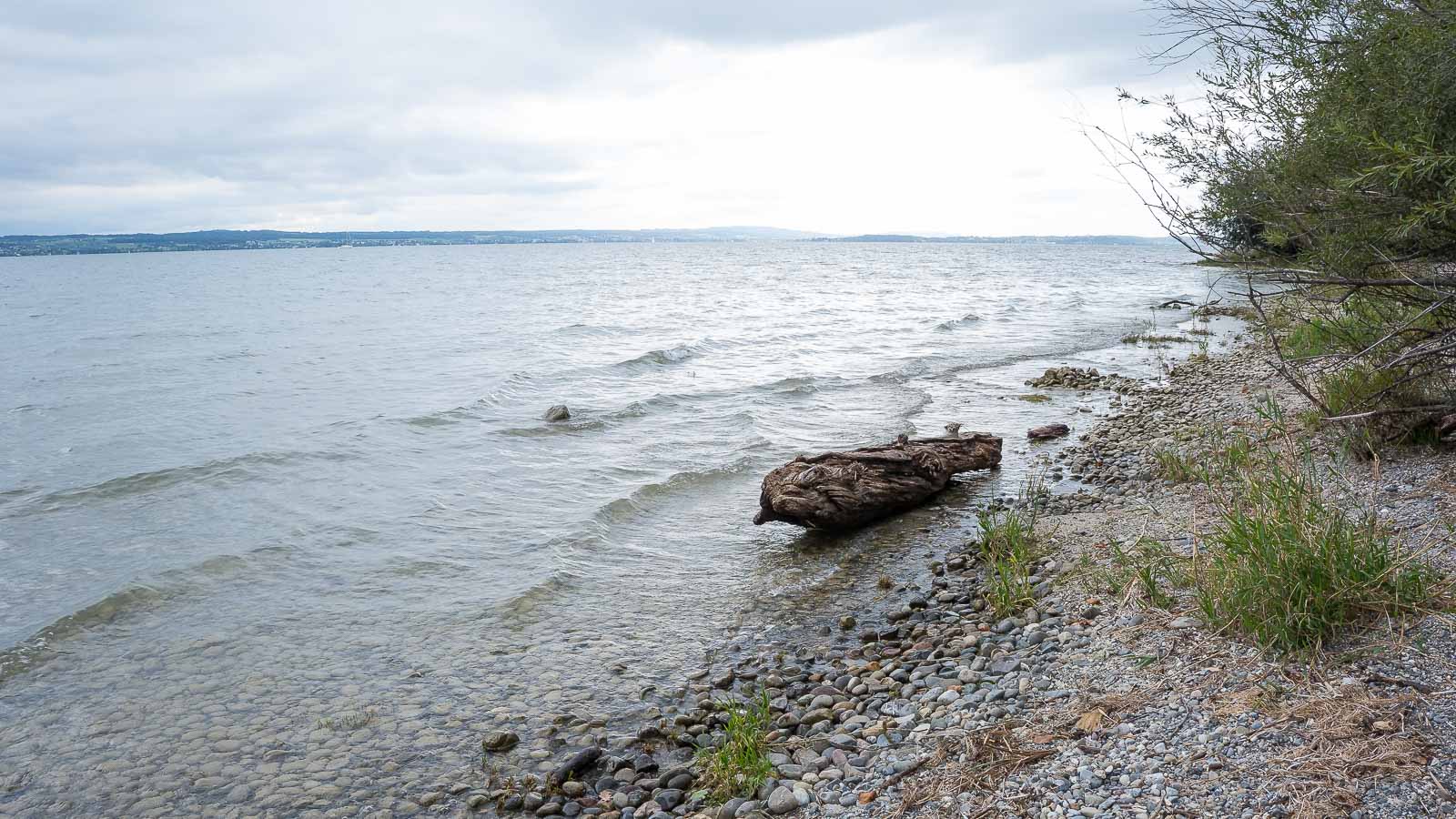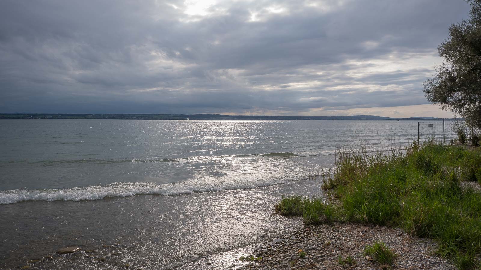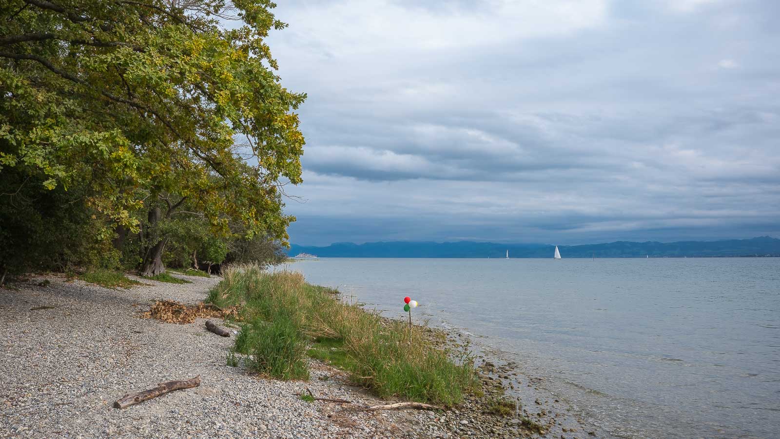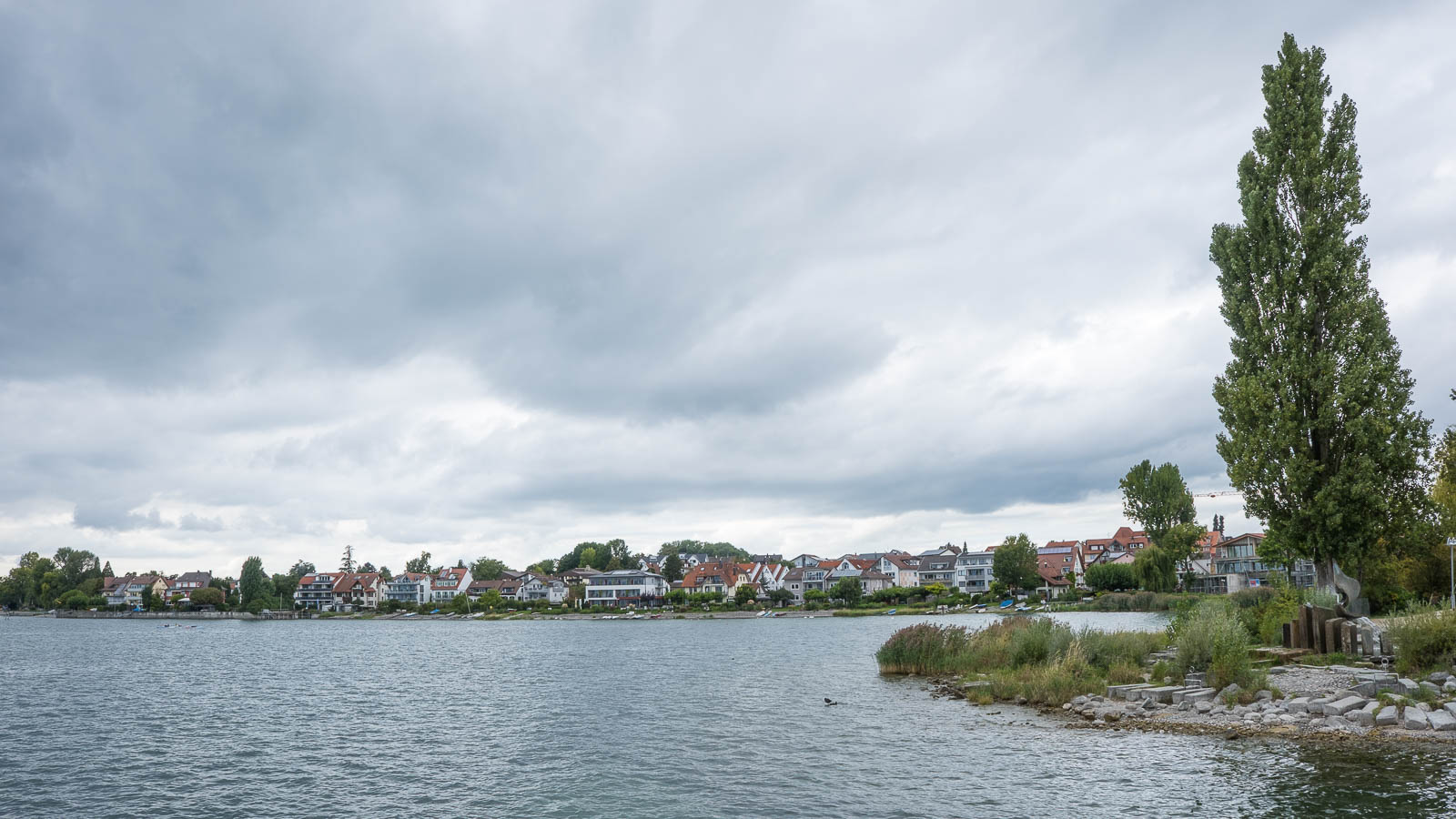 Vom Schiffsanleger aus mußten wir zunächst das Ufer verlassen und eine parallel zum Bodensee verlaufenden Seitenstraße nehmen. Hinter dem Schwimmbad ging es dann auf den Uferweg. Dieser war zum Glück für Radfahrer gesperrt, bot aber leider nur gelegentlich einen Ausblick über den See bzw. einen direkten Zugang zum Ufer. Vielerorts war der Uferbereich abgesperrt für Privateigentümer bzw. deren Feriengäste.