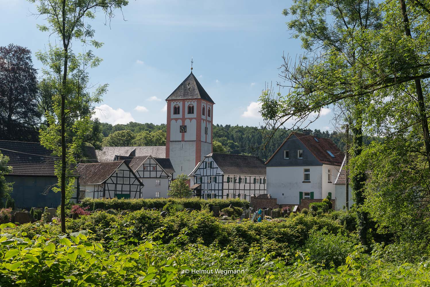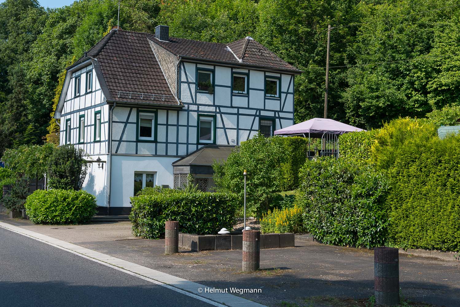 Die Durchquerung von Glöbusch kann man nun wirklich nicht als schöne Wanderstrecke bezeichnen. Sie geht durch eine bessere Wohngegend mit „gepflegter Langeweile“. Hinter Glöbusch steigt man hinab in das Dhünntal und von dort wieder auf die Höhe hinauf bei Erberich. Die Auf- und Abstiege waren wiederum herrliche Wanderstrecken. Bei dem finalen Abstieg kommt man am Hotel-Restaurant Wißkirchen vorbei. Dessen Außenterasse hatte auch mitten in der Woche geöffnet und war gut frequentiert.