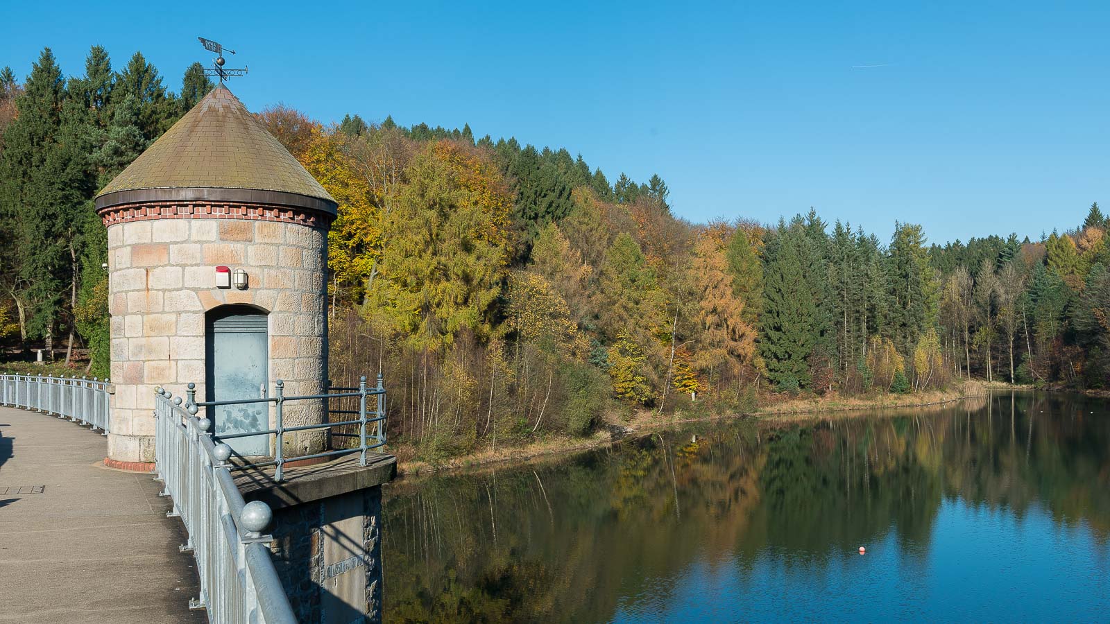 Es ging in den herbstlichen Wald hinein, zunächst überwiegend abwärts zur Ronsdorfer Talsperre. Hier machten wir einen kleinen Fotoabstecher auf den Staudamm bevor wir weiter hinab in das Saalbach Tal liefen. Kurz vor dem Steffenshammer ist ein etwas steilerer Abstieg zu absolvieren. Danach ging es gemütlich im Gelpetal bachaufwärts.
