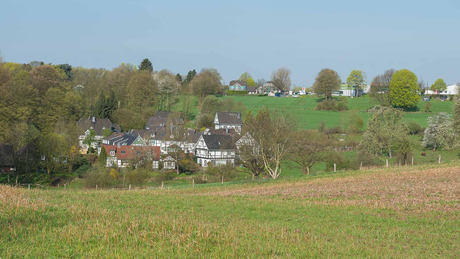 Nach Bellinghausen ging es über offenes Gelände, vorbei an blühenden Obstbäumen. Bellinghausen ist wegen seiner schönen Fachwerkhäuser einen Besuch wert. Am Ortsausgang gibt es einen Wanderparkplatz von dem aus man auch starten könnte (Vorsicht am Wochenende, da kann er schon mal voll sein).