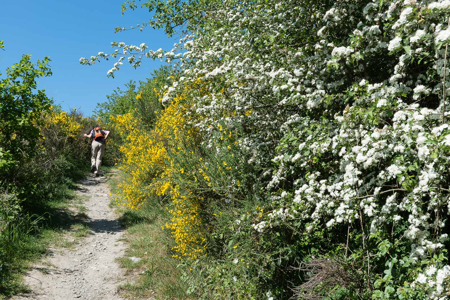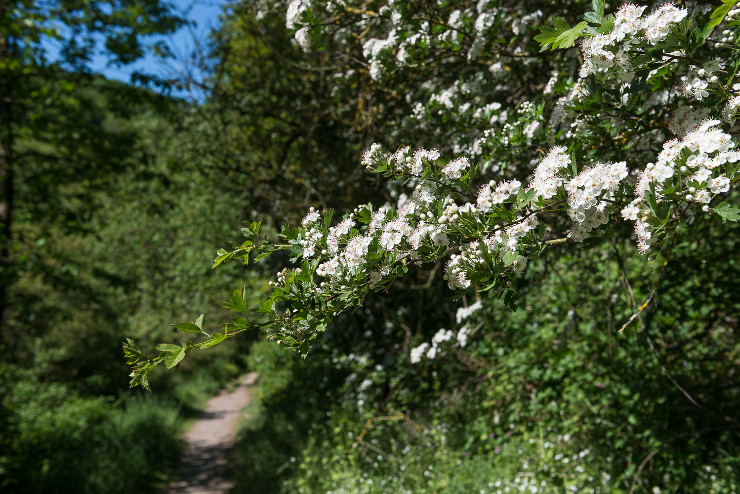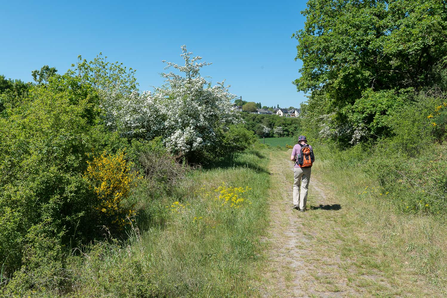 Es ging noch ein Weilchen geradeaus und dann bog der Weg nach links den Berg hinauf ab. Der Anstieg verlief durch blühenden Ginster und Weissdorn. Es war eine wahre Pracht. Dabei summte und brummte es überall. Die Vögel zwitscherten und die Schmetterlinge flatterten. Es war Frühling. Oben angekommen genossen wir die Aussicht über Trimbs und seine Nachbarorte.