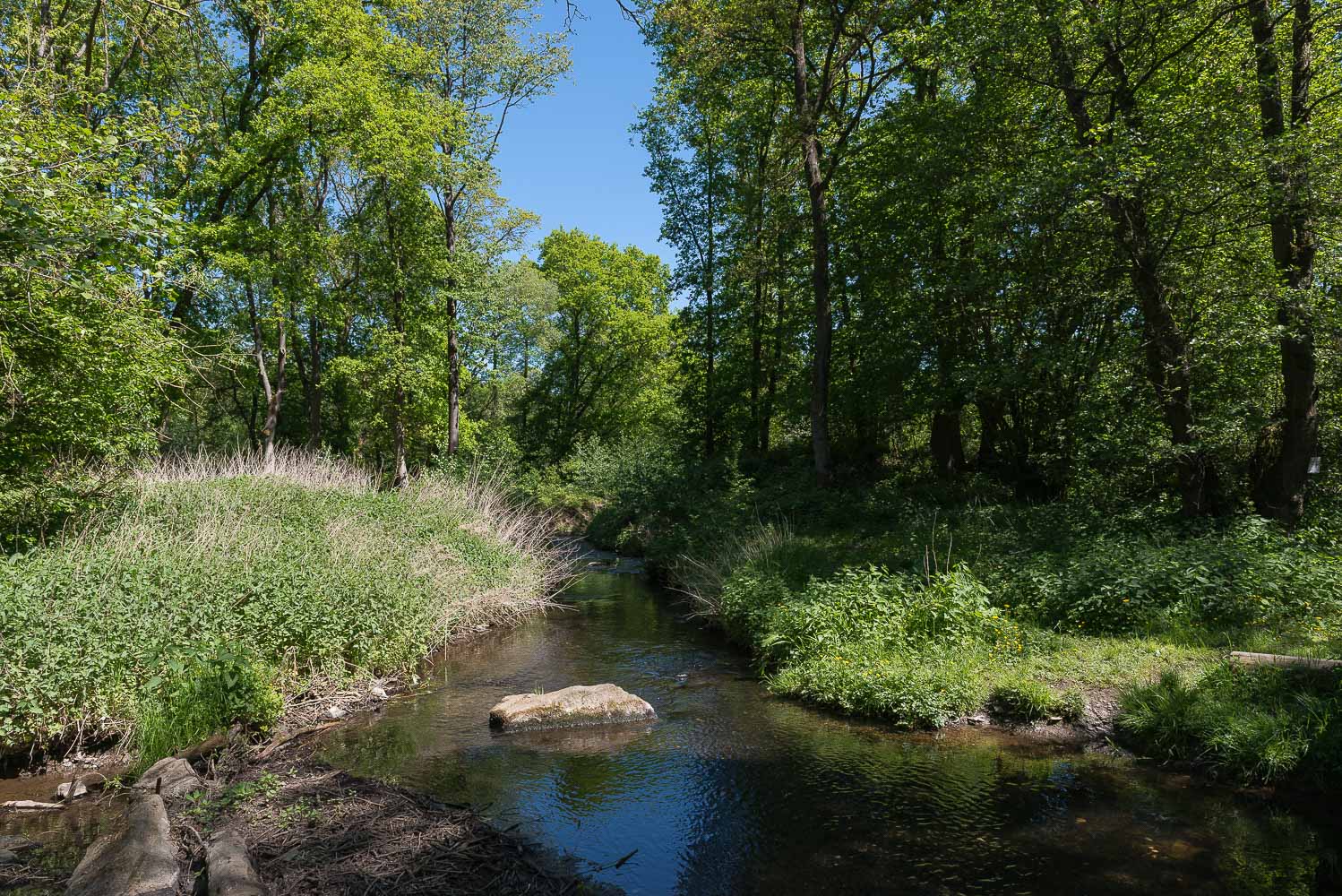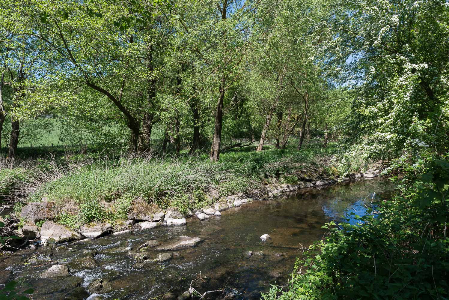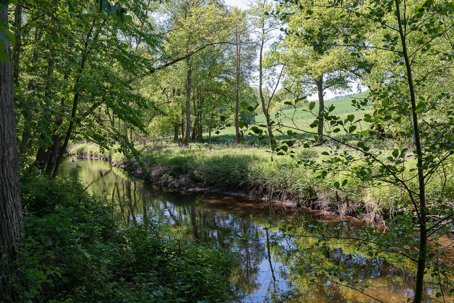 Der Weg ging auf der Höhe weiter über offenes Feld. Später stiegen wir dann sachte ins Tal hinab, dabei kamen wir an einigen ehemaligen Abbaustellen für Schiefer vorbei. Die Stollen konnten aber nicht betreten werden (Einsturzgefahr). Im Tal angekommen passierten wir einen Fischteich und überquerten anschließend die Nette, der wir danach für ca. 1 – 2 km folgten.