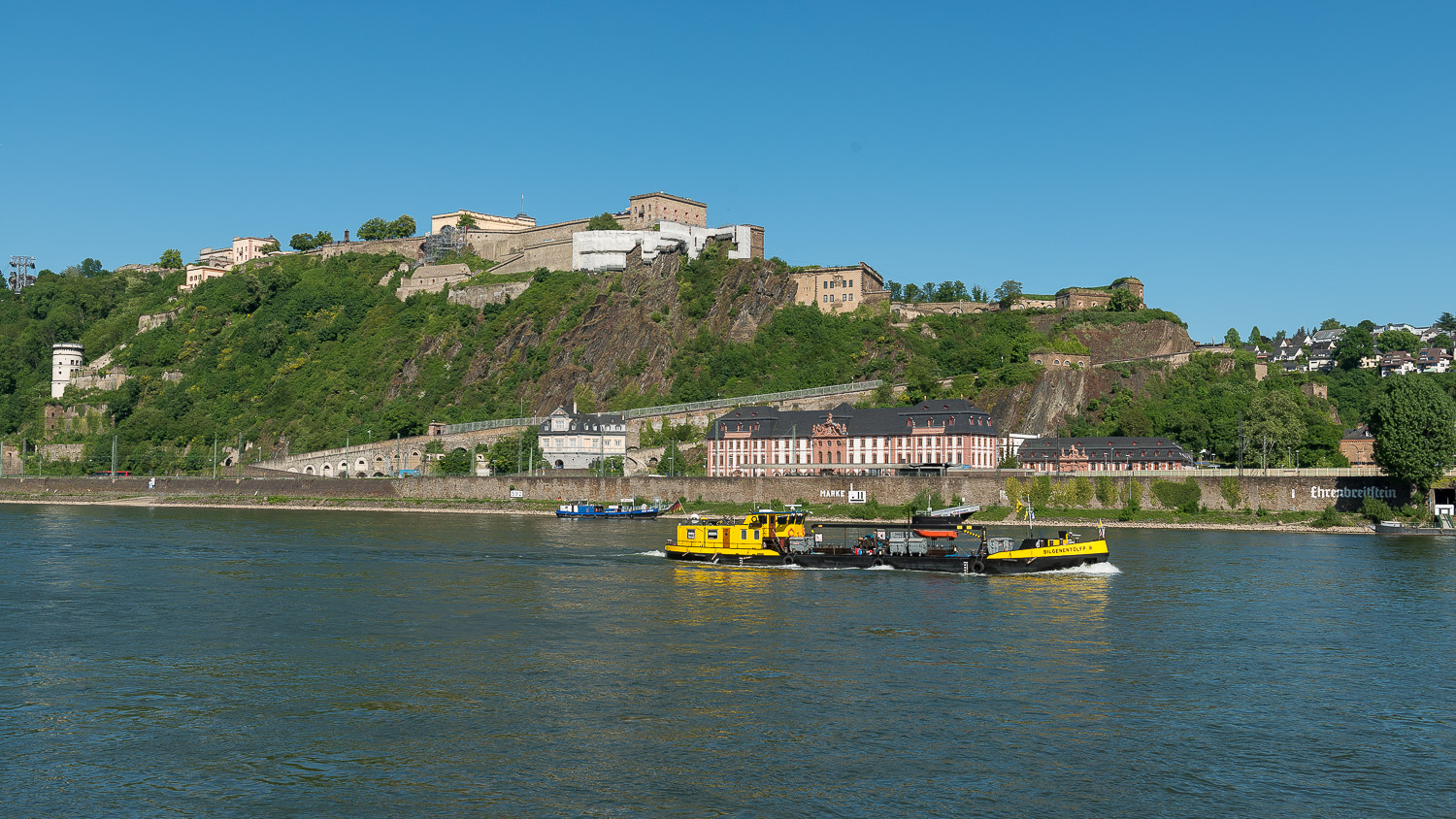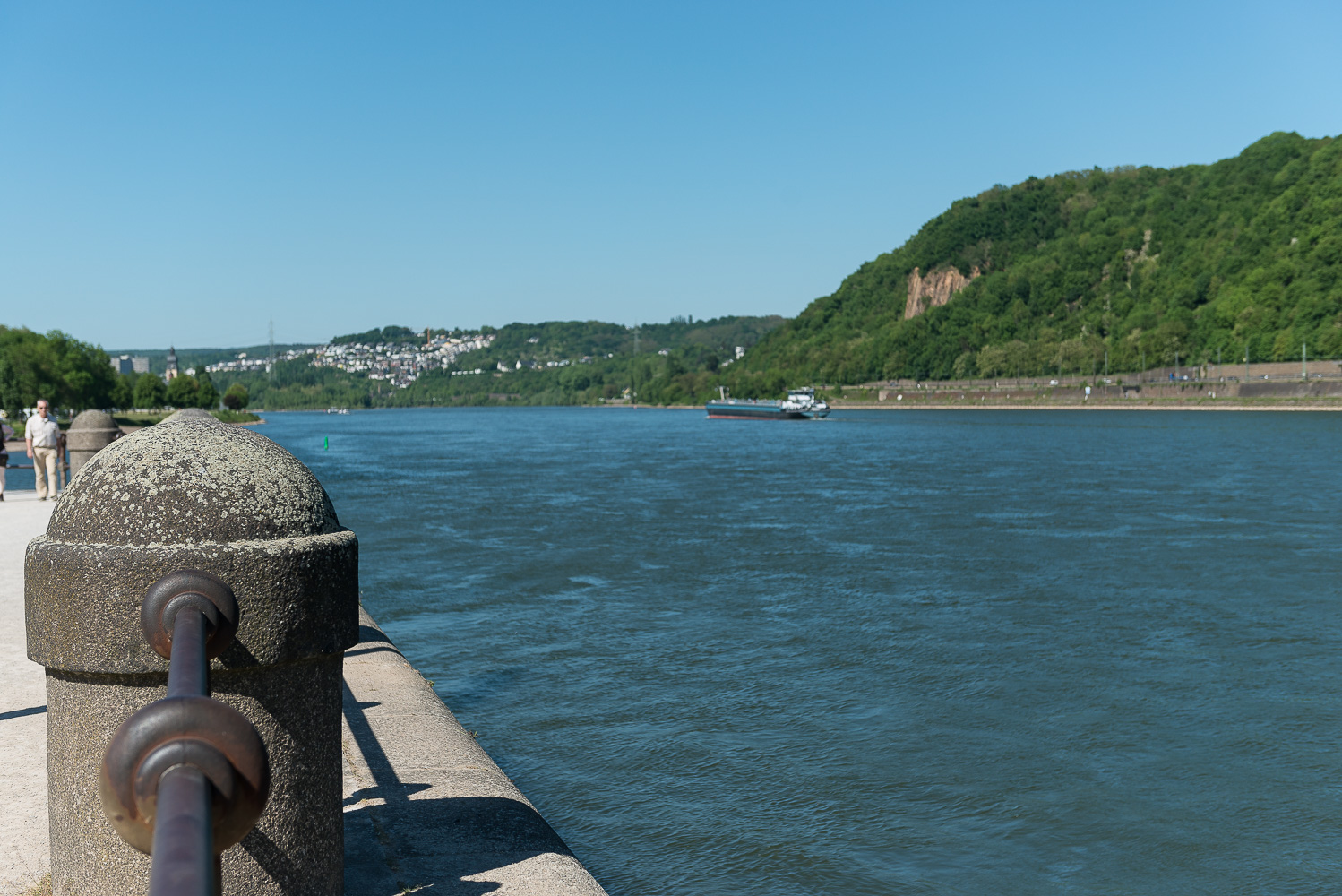 Nachdem wir wieder an unserem Parkplatz angekommen waren, wollten wir im Ort noch eine Cafe trinken. Das im Wanderführer empfohlene Lokal hatte wieder mal zu. So machten wir uns auf den Weg nach Koblenz. Dort bin ich vor langer Zeit mal zur Schule gegangen und hatte am Max-von-Laue-Gymnasium vor 46-Jahren Abitur gemacht. Die Schule stand immer noch. Wir besichtigten die Altstadt, das Deutsche Eck und das Schloss. Nach fast 3 Stunden Rumlauferei (mit gelegentlichen Bankpausen) hatten unsere Füße genug.