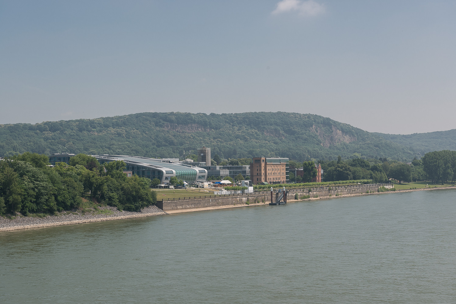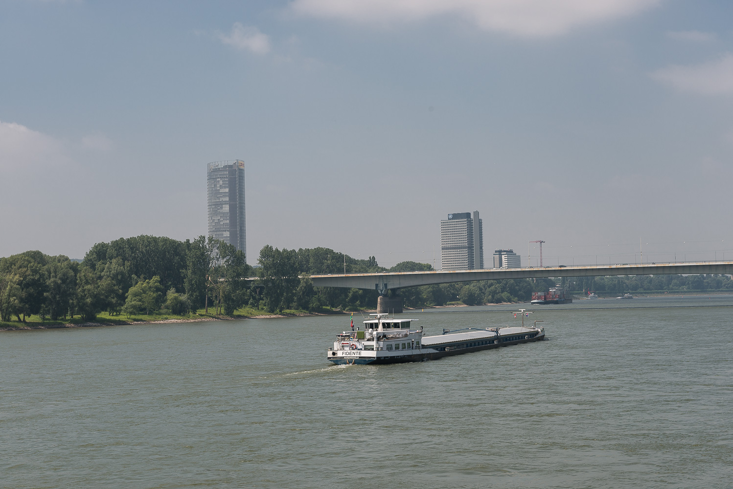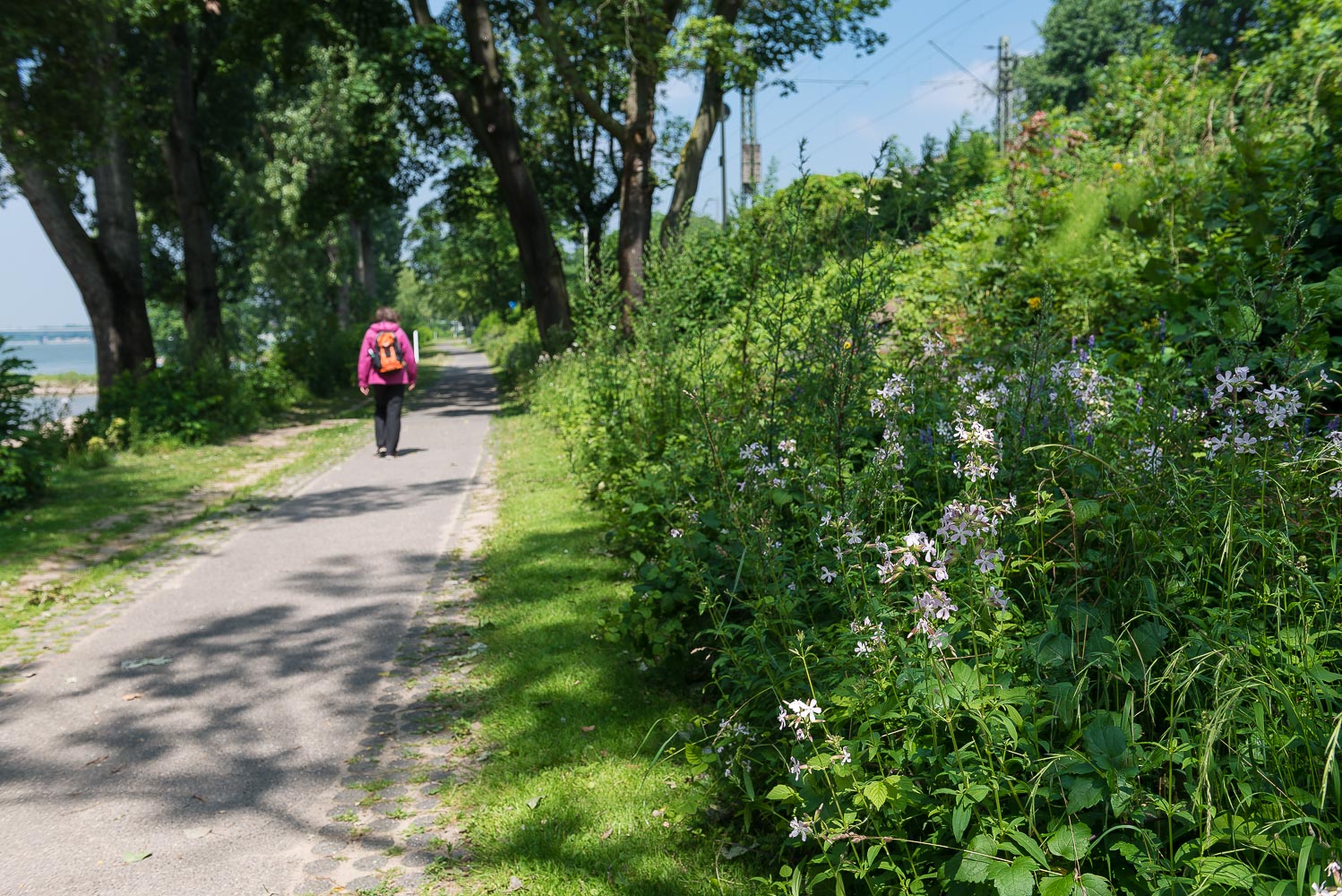 Von Niederdollendorf wanderten wir immer nah am Rhein entlang in nördliche Richtung und genossen die schöne Aussicht. In Oberkassel waren einige Spaziergänger unterwegs welche sich in ihrer Mittagspause die Füsse vertraten. Dort gab es direkt am Rhein einige neue Bürogebäude. Ansonsten waren auf der ganzen Strecke eigentlich nur Radfahrer unterwegs. Hinter Oberkassel ging es über die A 562 Autobahnbrücke auf die andere Rheinseite. Angeblich ist die A 562 die kürzeste Autobahn Deutschlands (laut Wikipedia).