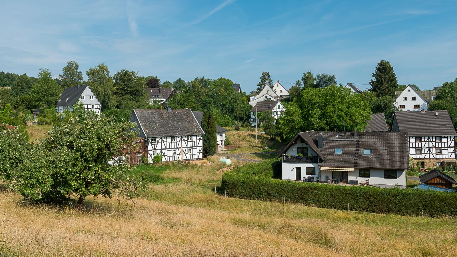 Das Wetter wurde langsam besser, war es zunächst noch deutlich bewölkt, so kam nun immer mehr die Sonne durch. Dies brachte mich dann doch etwas ins Schwitzen, was wiederum zahlreiche Bremsen anlockte. Echt lästig diese Viecher, gestochen haben sie natürlich auch. Am besten : immer in Bewegung bleiben. Das brachte mich dann schon bald nach Lindscheid. Hier gab es wieder zahlreiche Fachwerkhäuser zum fotografieren :