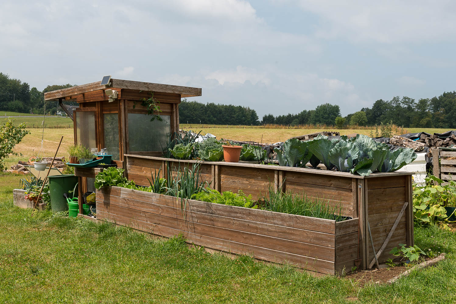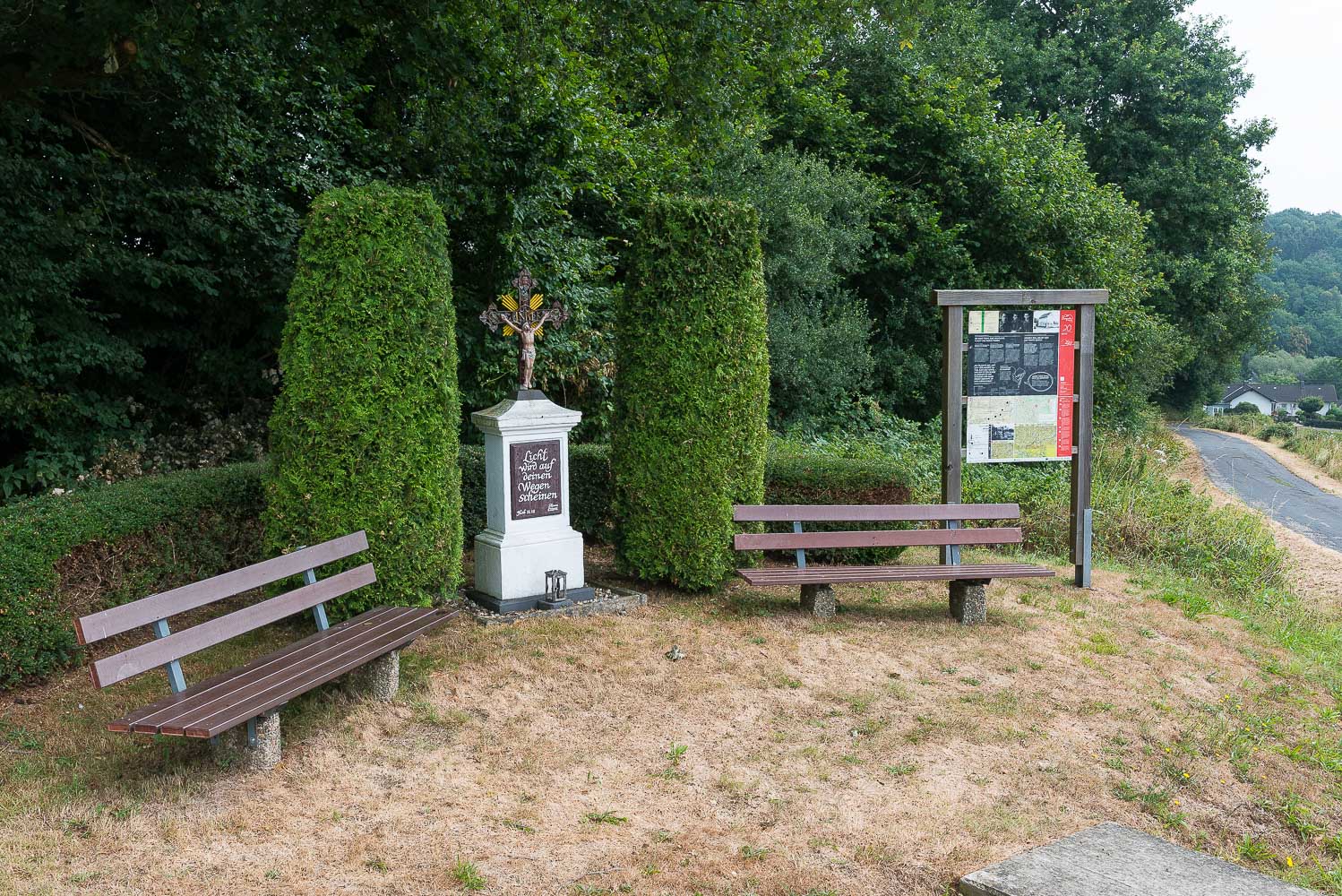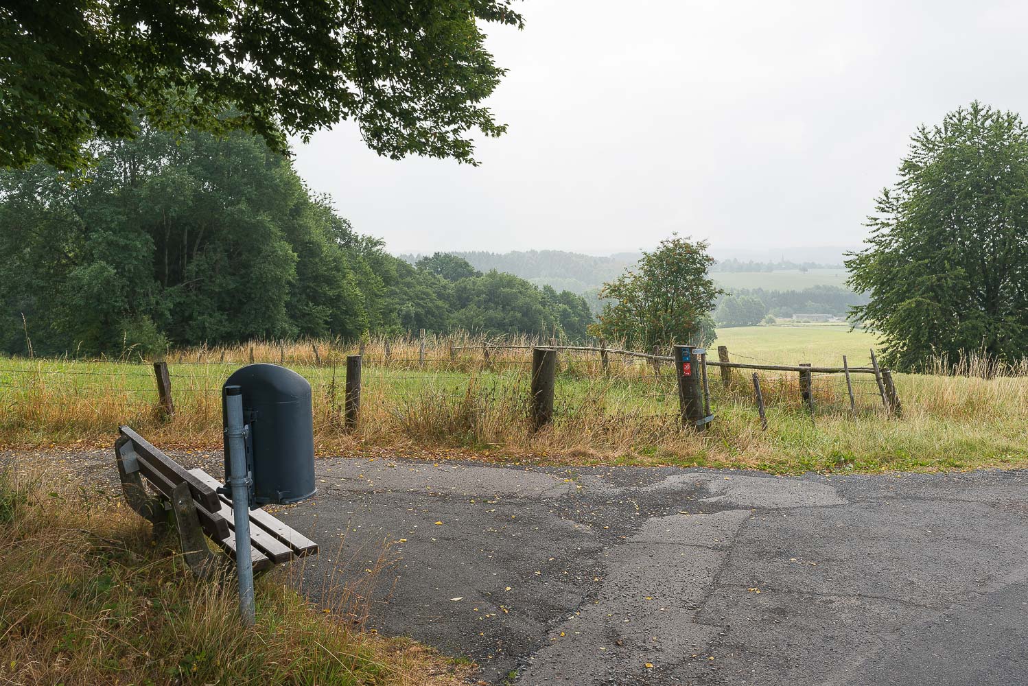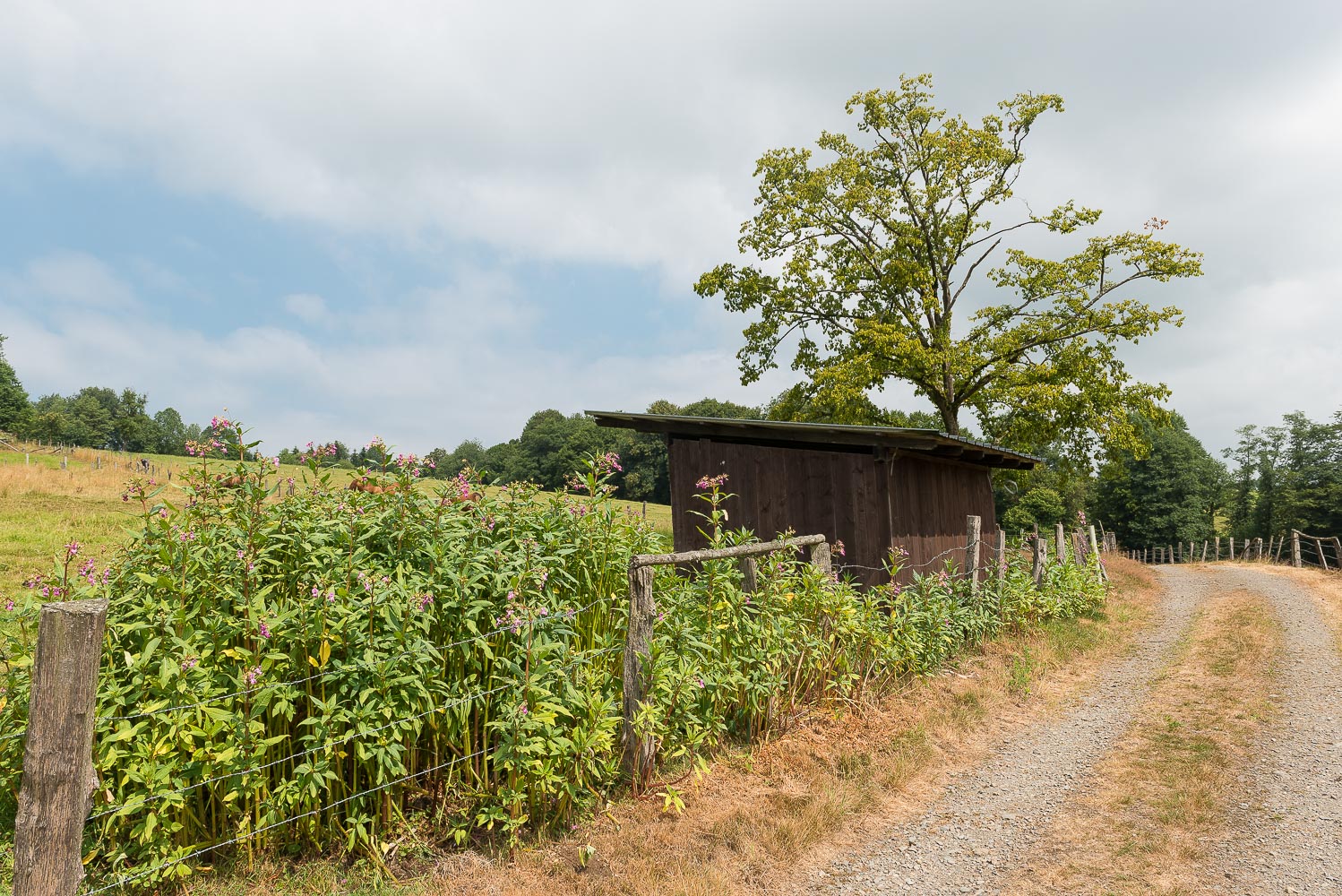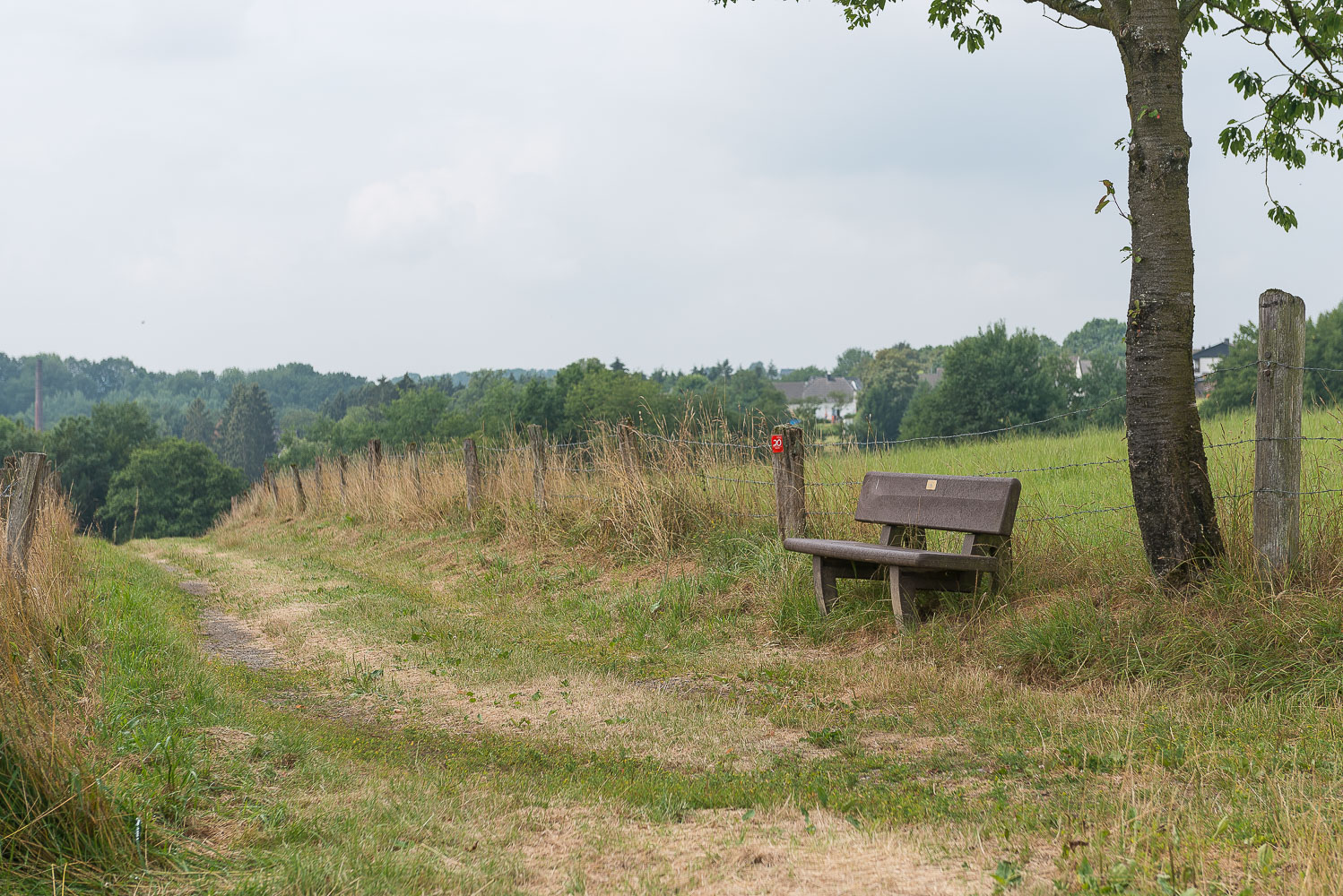 Die Wanderung verläuft auf den bergischen Höhen überwiegend in offenem Gelände auf breiten, meist asphaltierten Feldwegen. Als landwirtschaftliche Nutzung überwog die Weidewirtschaft. Das Gras war fast überall frisch gemäht. Damit es besser nachwächst hatte man es reichlich mit Gülle bedacht. Das mag zwar gut für das Gras sein, aber schlecht für das Grundwasser und schlecht für meine Nase.