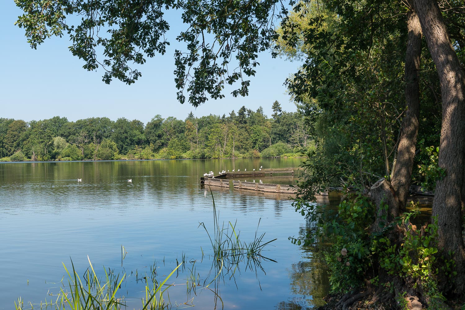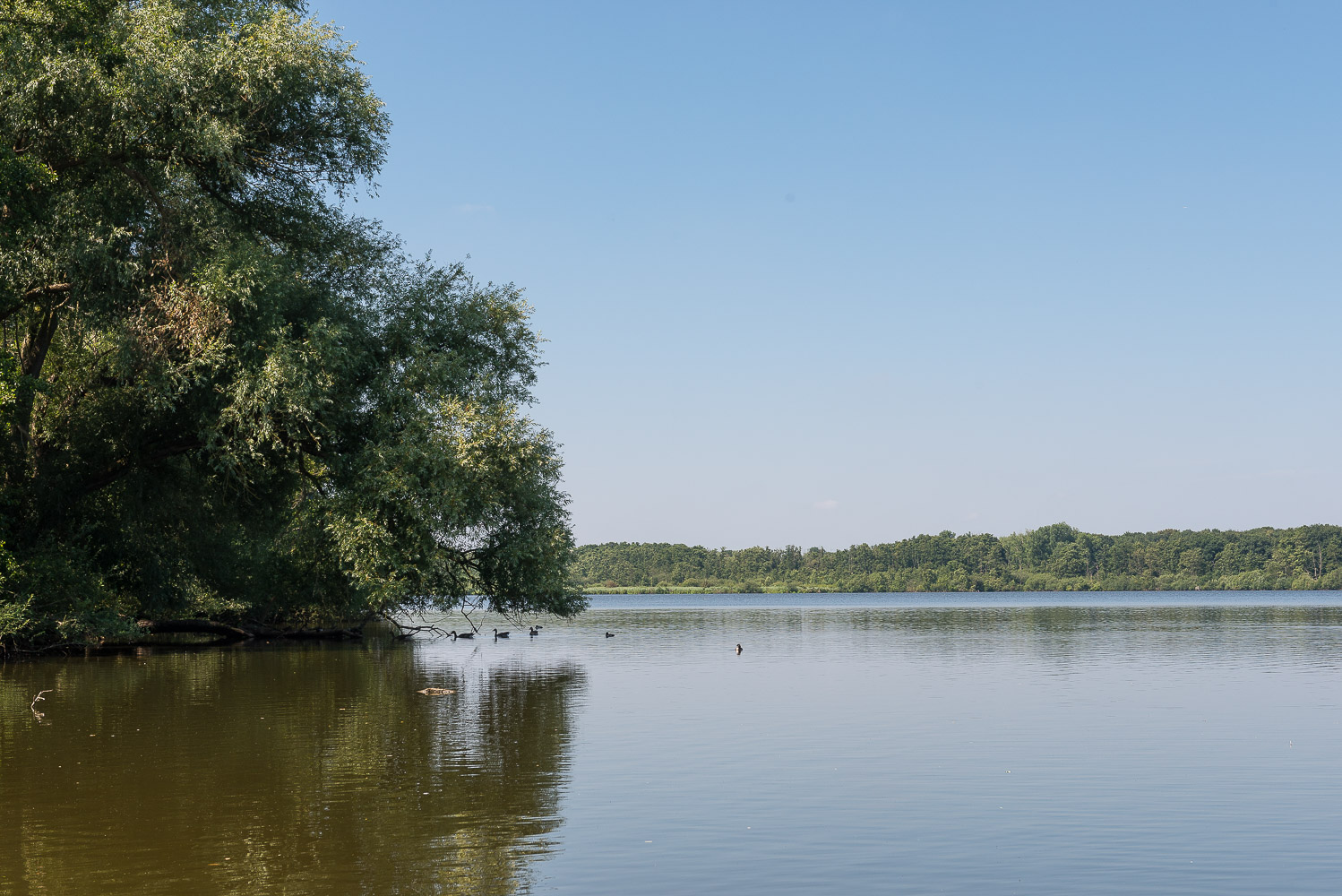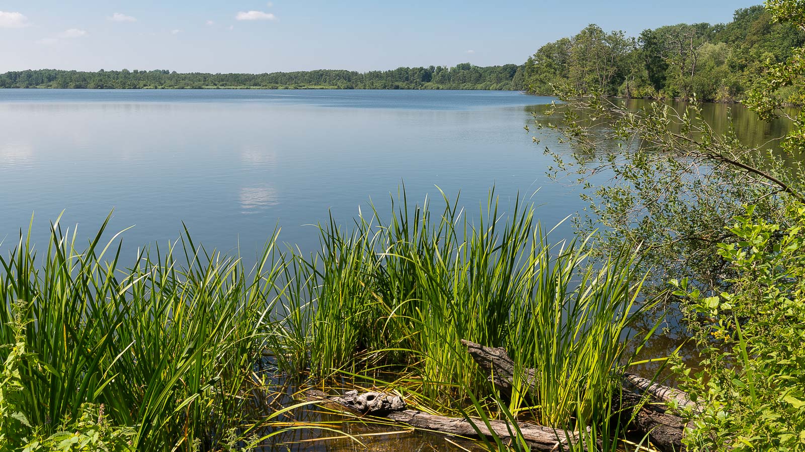 Die ersten 4 km der Wanderung verliefen durch offenes Gelände auf schönen Feldwegen, z.T. am Waldrand entlang. Ich dachte spontan : es kann auch ohne Berge schön sein (obwohl mir das Flachland ansonsten eigentlich nicht so sehr liegt). Nach 4 km kamen wir dann zu einem mit Bäumen und Sträuchern bewachsenen Damm, der zwei grosse Seen, den Glabbacher Bruch und den Hinsbecker Bruch, voneinander trennte.