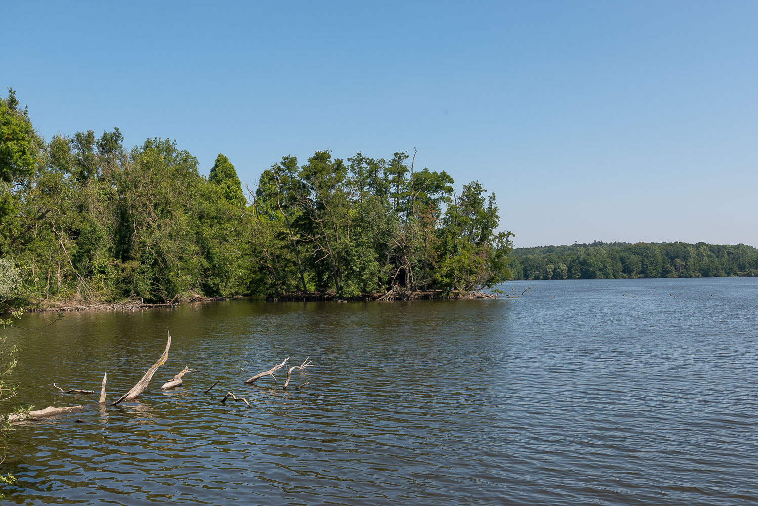 Danach kommt man zu einem Sumpf- und Tümpelgebiet. Wegen der langen Trockenheit liegt ein Teil der Teiche trocken. Auch einige der vorherigen Äcker machten einen trockenen Eindruck. Die Kartoffelfelder wurden künstlich bewässert. Der „Tümpelteil“ der Wanderung ist gut geeignet für Vogelbeobachtungen. Es waren auch einige Fotografen mit den entsprechenden Linsen unterwegs. An einer Stelle gibt es einen erhöhten Unterstand von dem aus man die Tiere beobachten kann.