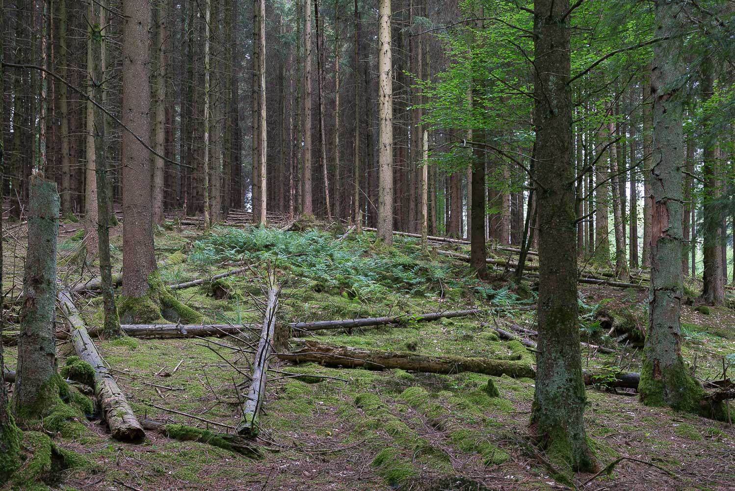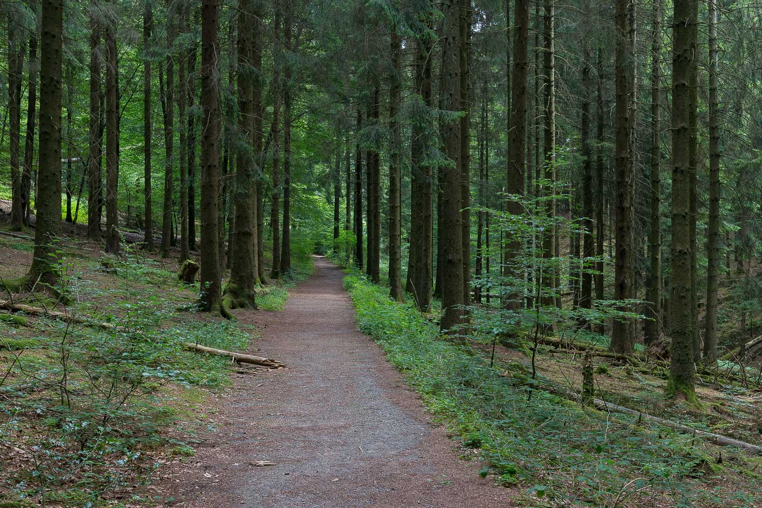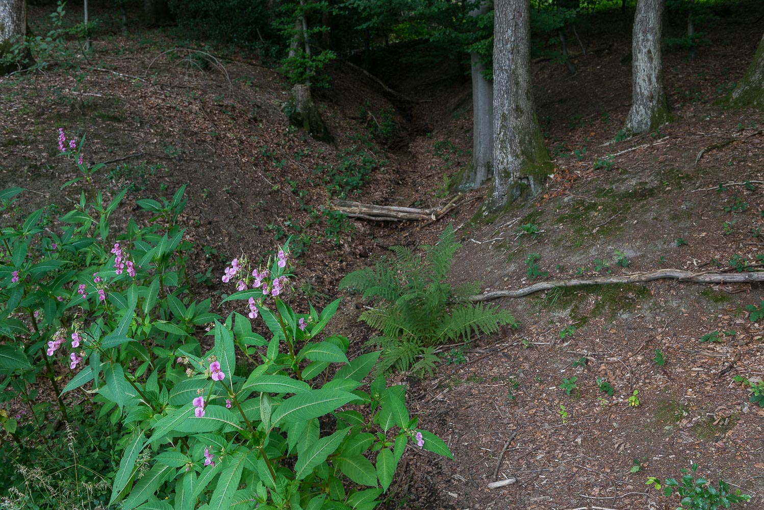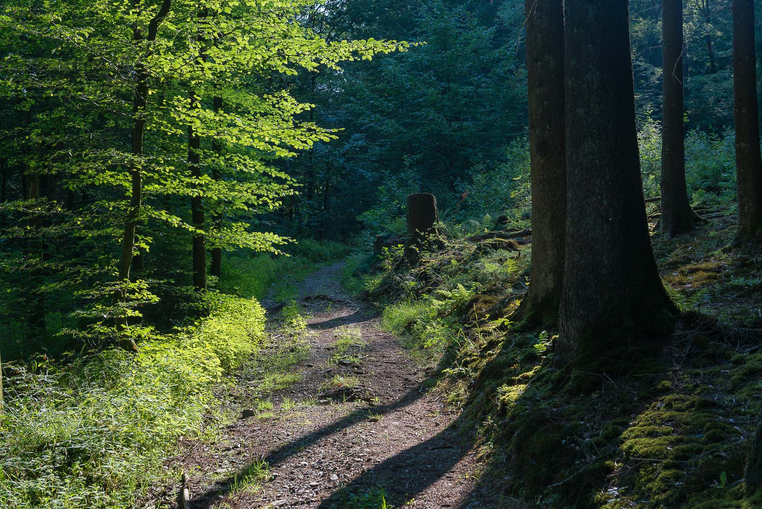 Also machte ich mich alleine los. Ich startete um 8 Uhr 20. Da war es schon 20°C warm. Der Weg ging für etwa 1 km bergab in das Tal eines namenlosen Baches. Das Waldgebiet der Wanderung heißt auch Mul. Ich hatte noch nie etwas davon gehört, den Namen las ich zum ersten Mal in dem Wanderführer. Auch „Dr.Google“ konnte wenig bis gar nichts dazu sagen.