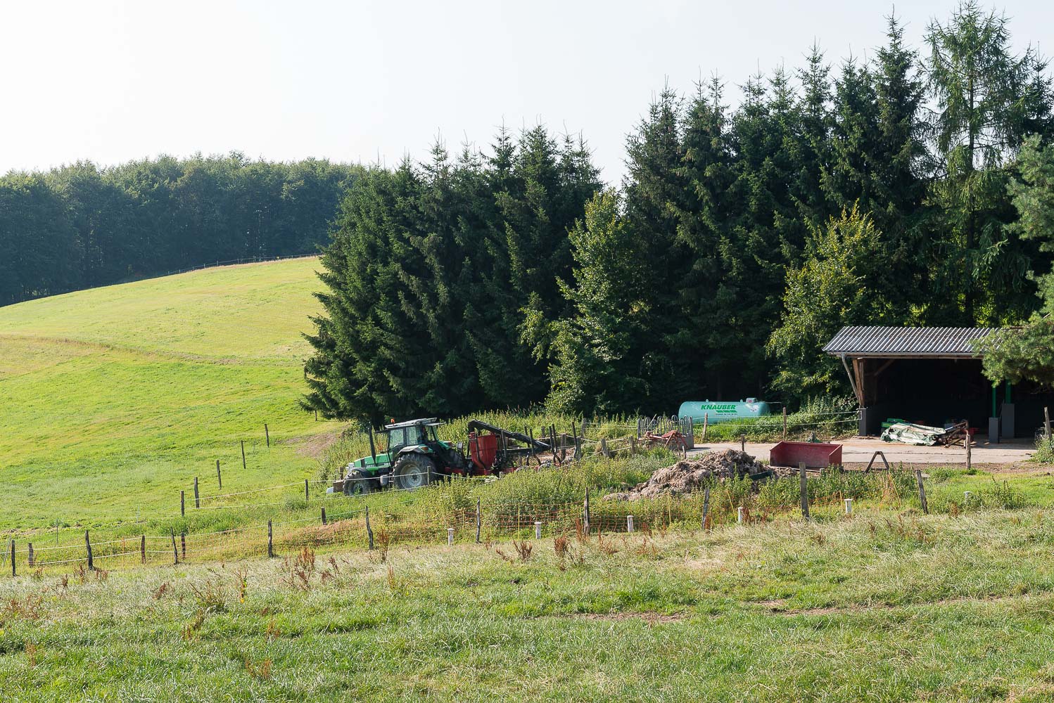 Nach einem kurzen Stück im Tal ging es an der anderen Talseite wieder bergauf. Oben angekommen wurde das Gelände offener und ich kam an dem Weiler Oberburghof vorbei. Unterwegs hatte man passable Fernsicht über das bergische Land. Nach etwa 2 km Wanderung auf dem Bergrücken ging es wieder durch den Wald talwärts. Unten angekommen erreichte ich den Weiler Purd. Das war der südlichste Punkt der Wanderung und sozusagen „Halbzeit“. Bis jetzt war mir außer einem Reh noch kein Lebewesen begegnet.